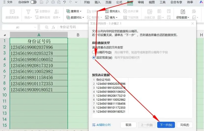 首先,选中目标区域(如下图A列),点击“数据”,再点击“分列”,在弹出的文本框里,勾选“固定宽度”,再点击“下一步”。