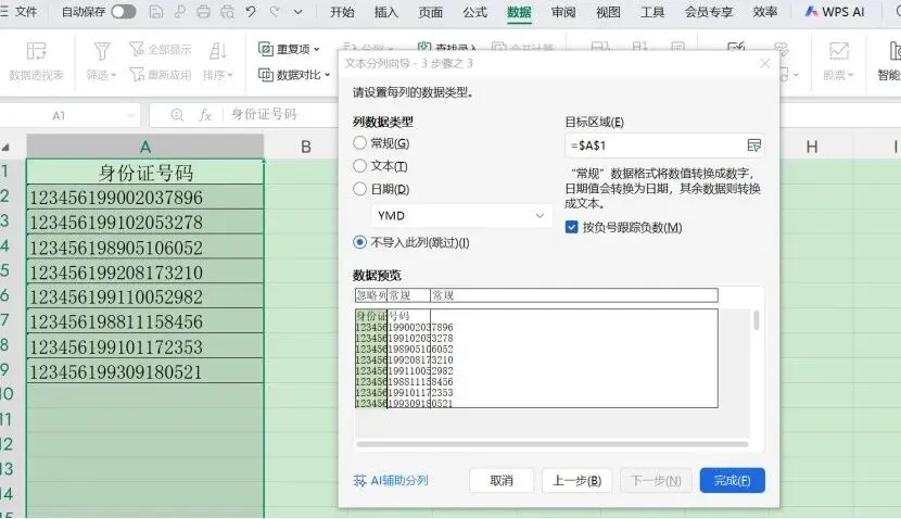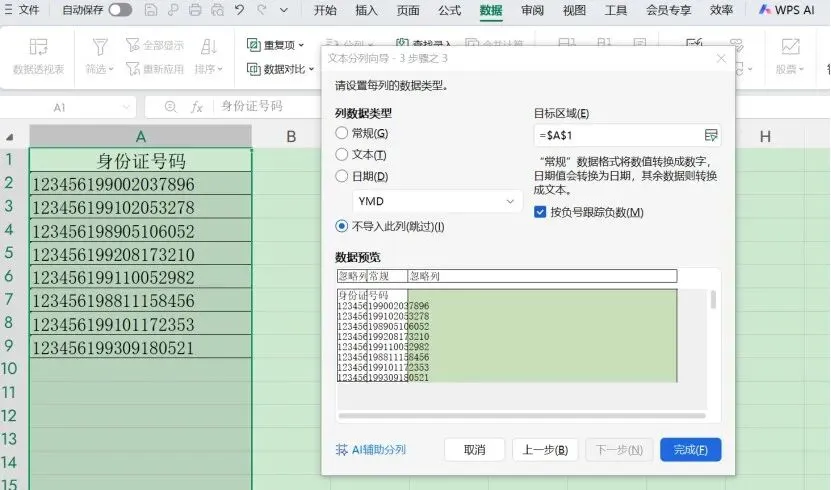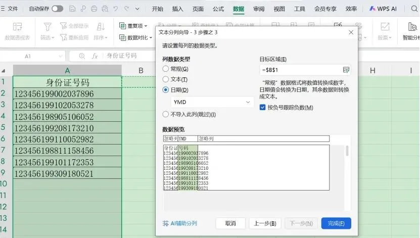 然后,选中“常规”那列的出生日期,勾选上方的“日期”,选中“YMD”,接下来在“目标区域”里点击B1单元格,再点击“完成”,即导出了所有的出生日期。