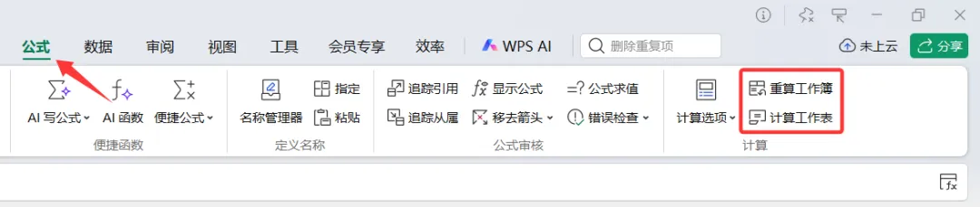 2. 在手动计算状态下,在【公式】选项卡下单击【重算工作簿】按钮或按F9键,可以重新计算整个工作簿中的全部公式;在【公式】选项卡下单击【计算工作表】按钮或按SHIFT+F9键,可以只重算当前活动工作表中的全部公式。