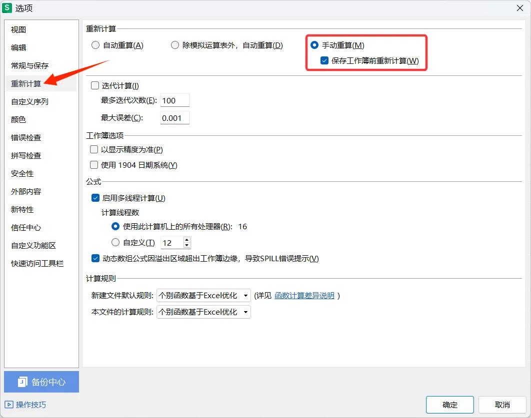 3. 在手动计算状态下,软件可以通过【保存工作簿前重新计算】功能防止保存过时数据。【保存工作簿前重新计算】功能是默认开启的,可执行【文件】-【选项】命令打开【选项】对话框查看。开启【保存工作簿前重新计算】功能后,当你修改数据后忘记按F9刷新,保存工作簿前软件会自动执行一次重算,确保存入文件的是最新正确结果。