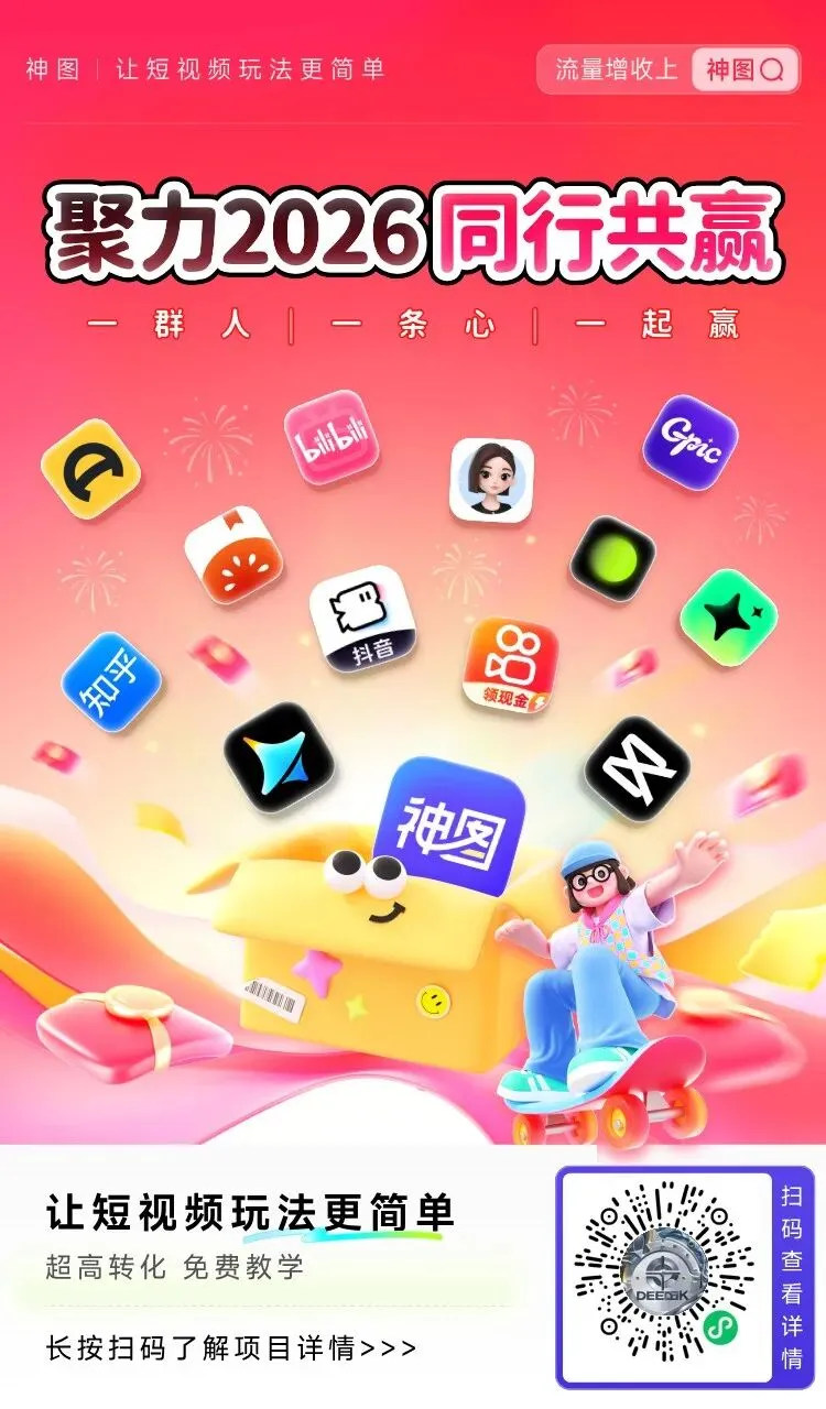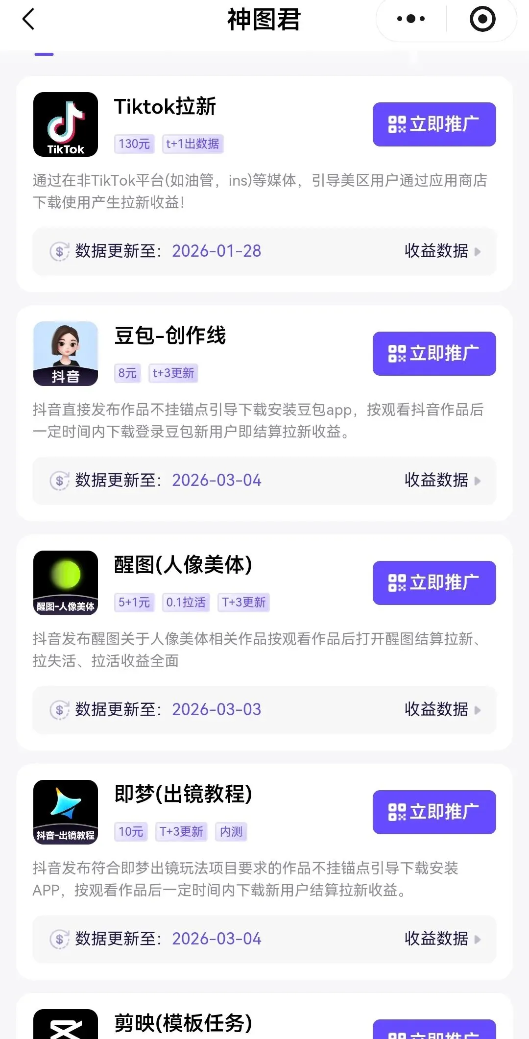 这个神图数据比任推邦类推广平台简单,它主推抖音,剪映,醒图,小红书等,推一个5-12元,海外版价格还高。主要是挂锚点链接推广,它的好处就是直接变现快,虽然对推广平台粉丝没有太多要求,但做的视频没有流量也很难变现。