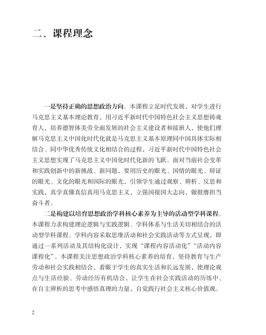 课程理念更突出理论根基,新增两个结合、习近平新时代中国特色社会主义思想的理论飞跃等表述,强化强国报国、挺膺担当的价值导向。