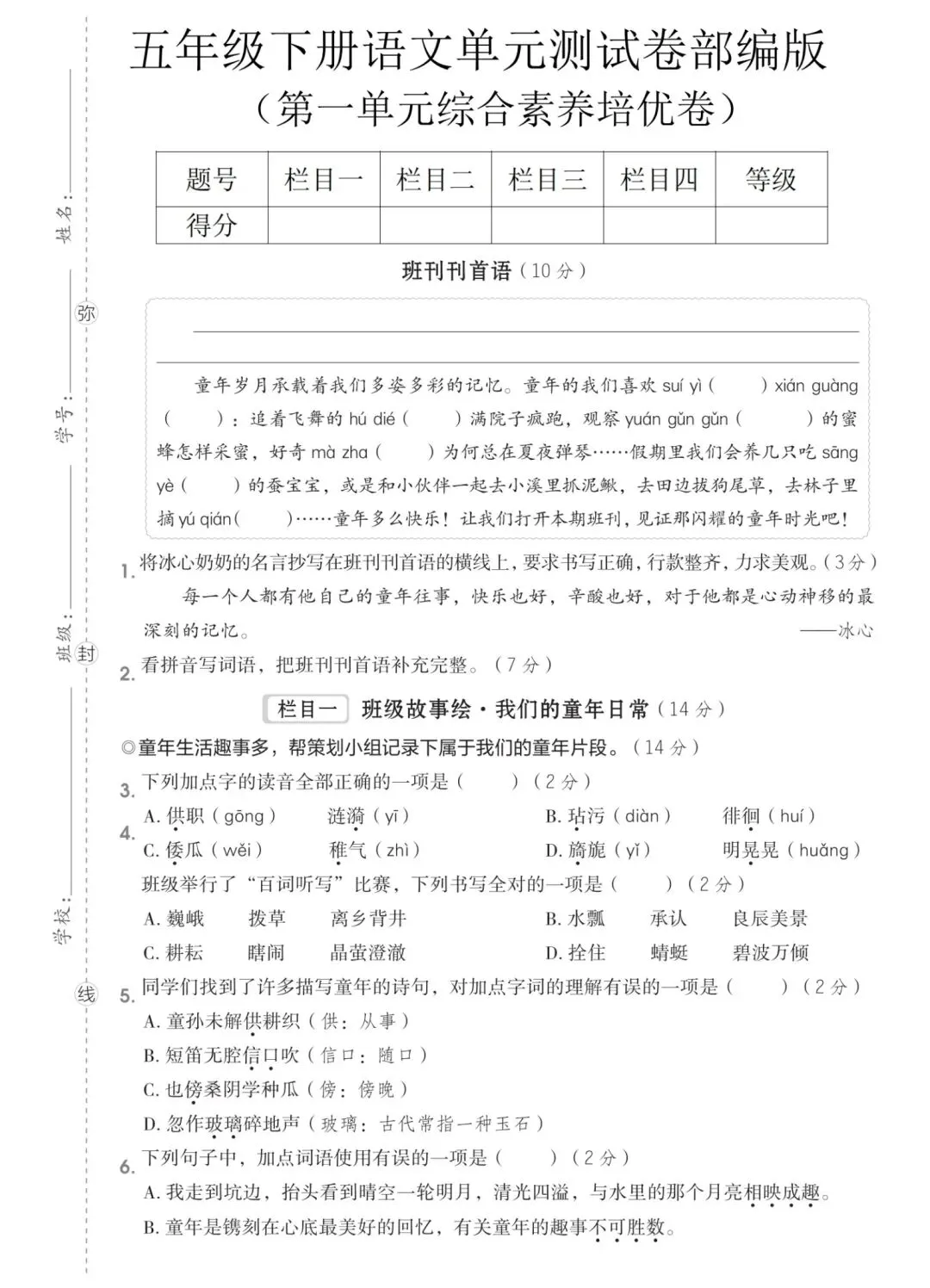 新版五年级下册语文第一单元测试卷含答案可打印