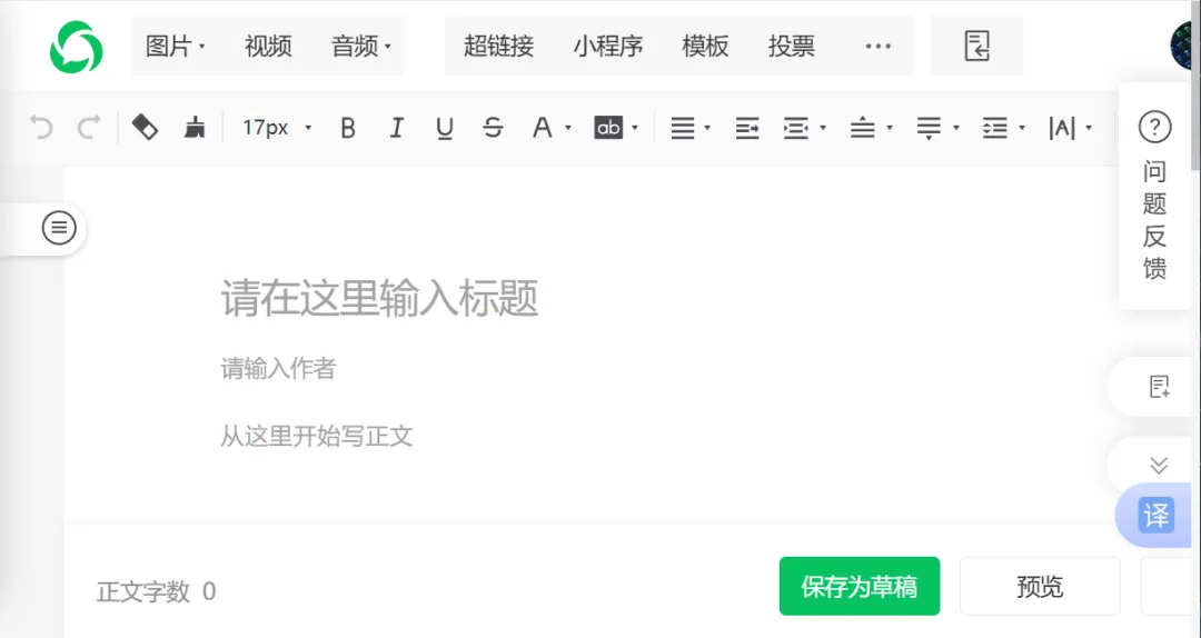 这里的功能可以说是最全、最强大的:文章、贴图、视频、音频均可操作,自定义菜单、自动回复、页面模板、流量主、原创声明、赞赏、定时发布、数据分析、留言管理、素材库、多图文、投票、小程序/视频号关联、开发者配置、认证、权限管理,各种功能全部支持操作。