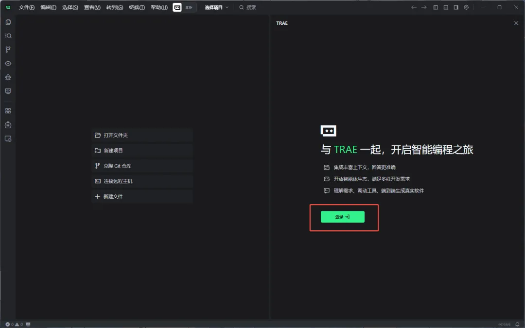 在网页界面完成登录后,点击“登录并打开 TRAE”,即可自动进入 Trae 客户端。