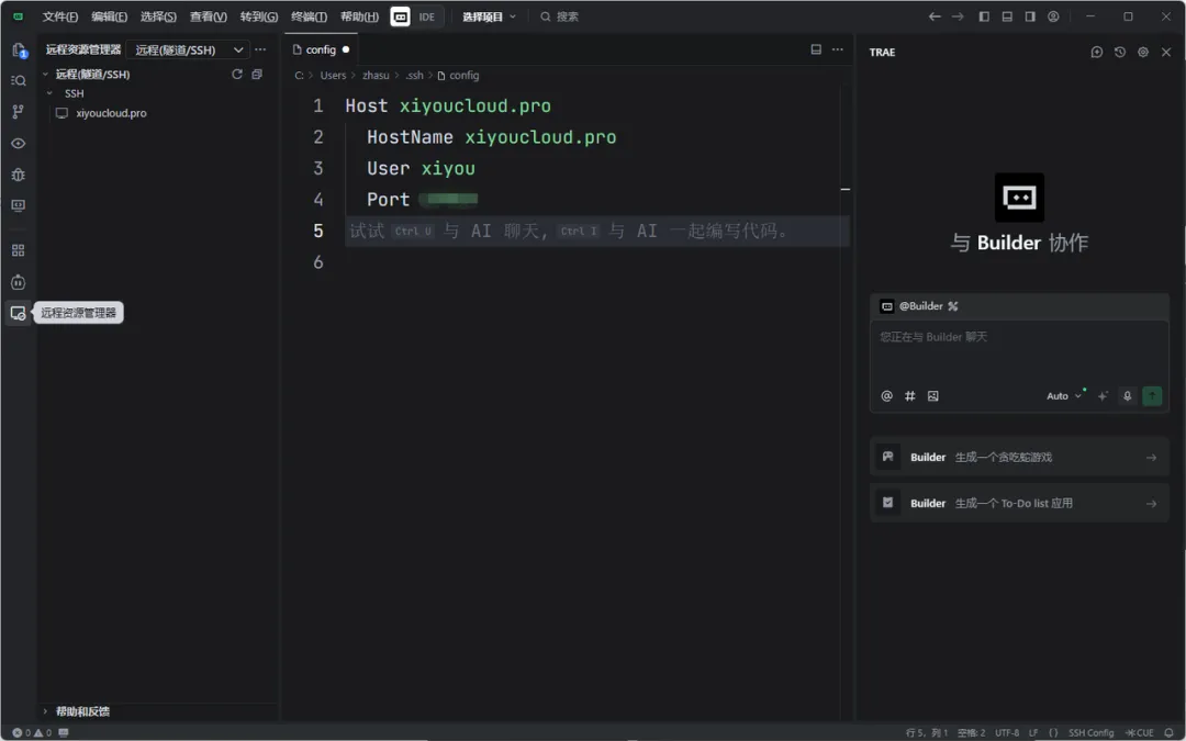 注意,在连接远程主机时,如果点击“打开配置”,会跳转至 SSH 配置界面。之后您也可以直接通过远程资源管理器界面进行连接。