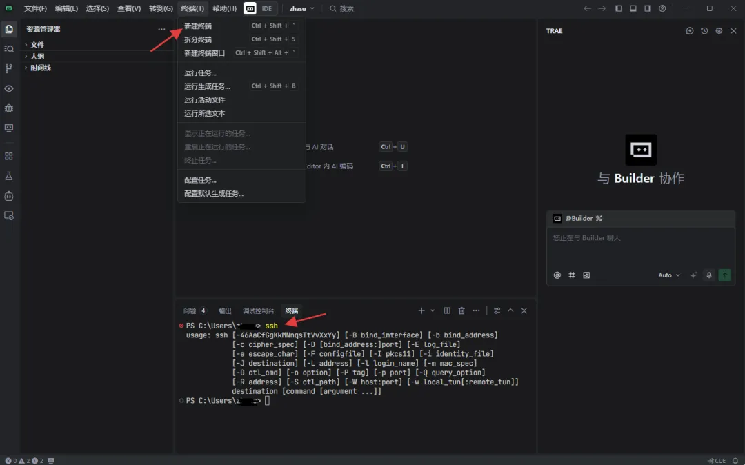 本地生成SSH密钥(如果之前生成过,就不要生成了,以免覆盖以前的文件了),文件生成的默认目录在用户目录的.ssh文件夹下。本地怎么生成SSH密钥?使用CMD或者Trae的本地终端都是可以的。