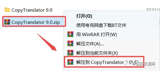 1.选中下载的压缩包,然后鼠标右键选择解压到“CopyTranslator 9.0”(没有解压选项点这里)
