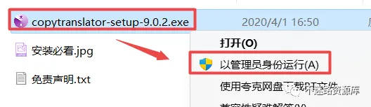 2.打开刚刚解压的文件夹,鼠标右键点击“copytranslator-setup-9.0.2.exe”选择“以管理员身份运行”