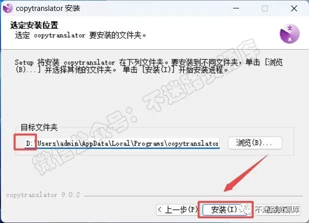 5.点击“浏览”可以选择软件安装路径,建议和教程中的保持一致,本例安装到D盘(将路径地址中的首字符C改为D表示安装到D盘,或者可以在其它磁盘里创建一个新的文件夹,安装路径不要出现中文),点击“安装”