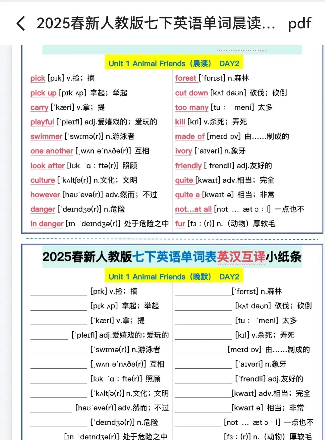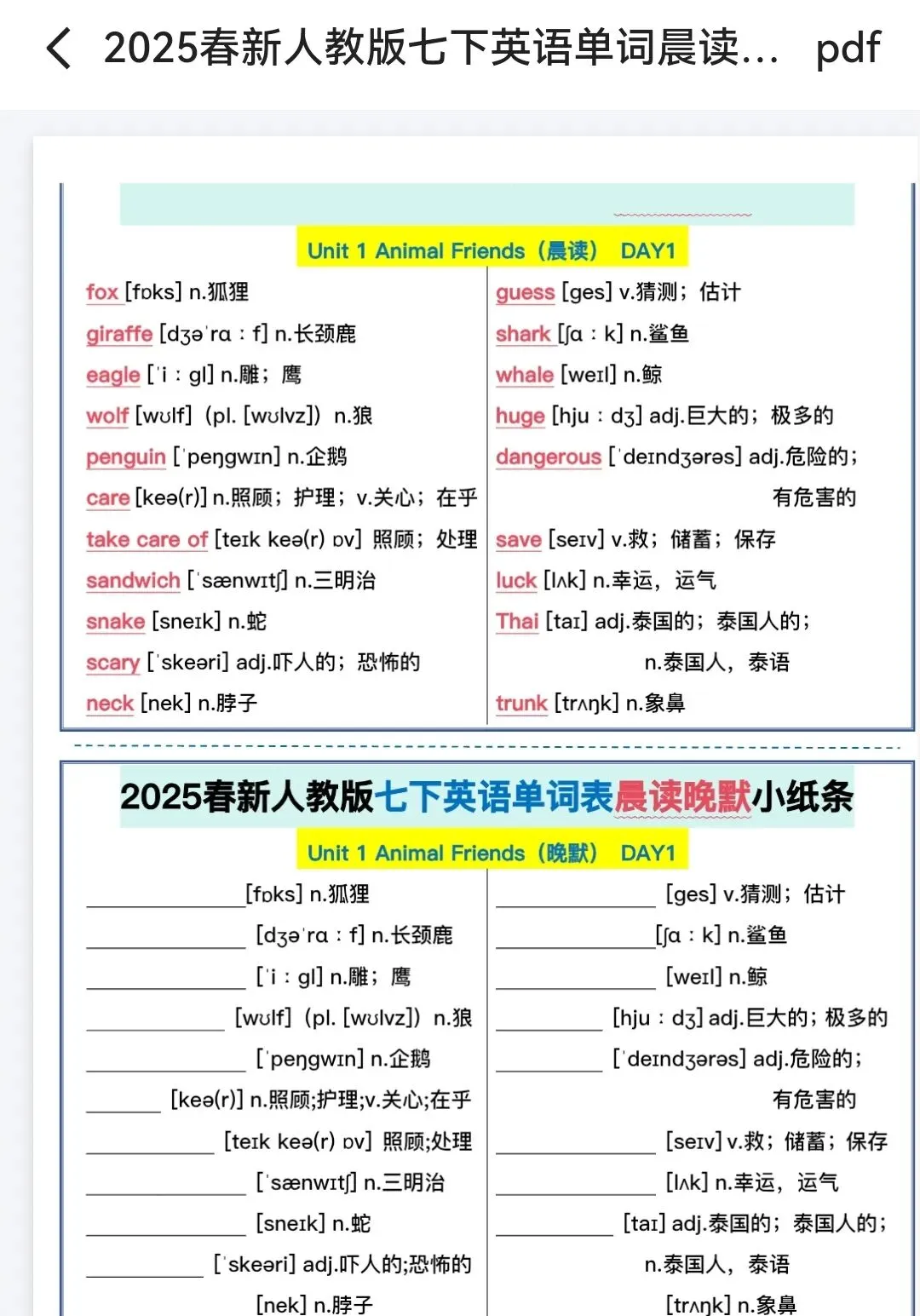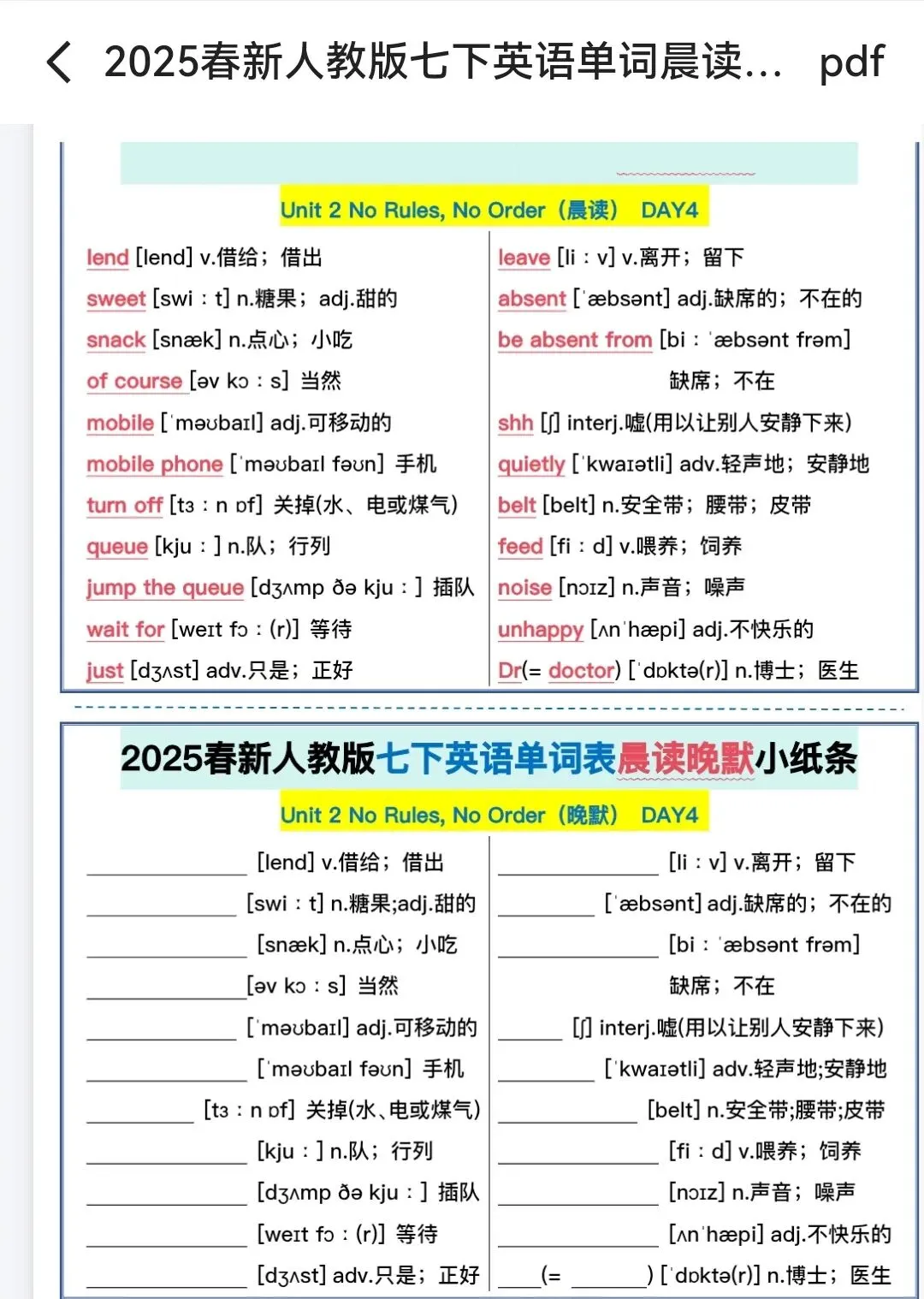 新学期已经开始,很多家长都在为孩子英语单词记不住而发愁。别担心!今天给大家带来一份超实用的学习资料——人教版七年级英语下册【单词晨读晚默】小纸条,帮孩子轻松搞定单词关!