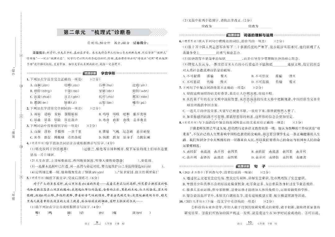 【七年级下册语文】【人教部编版】第二单元梳理式诊断卷+过关检测卷带答案解析|完整高清可打印