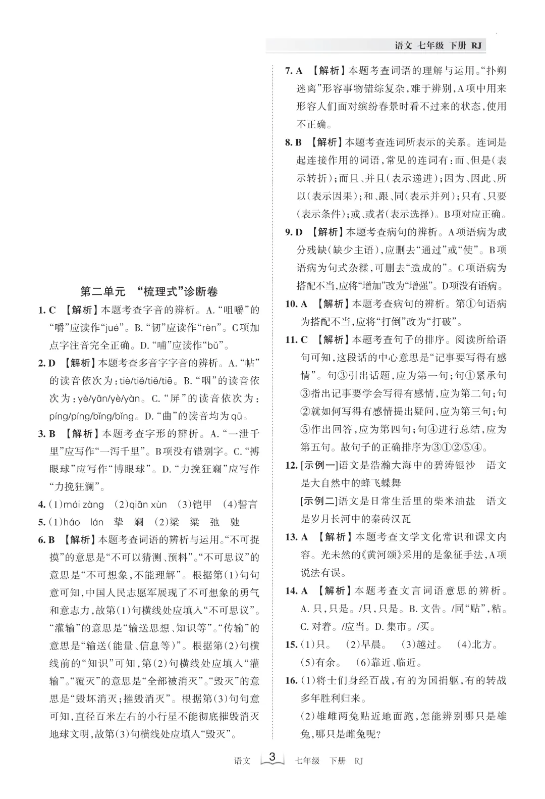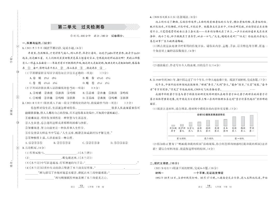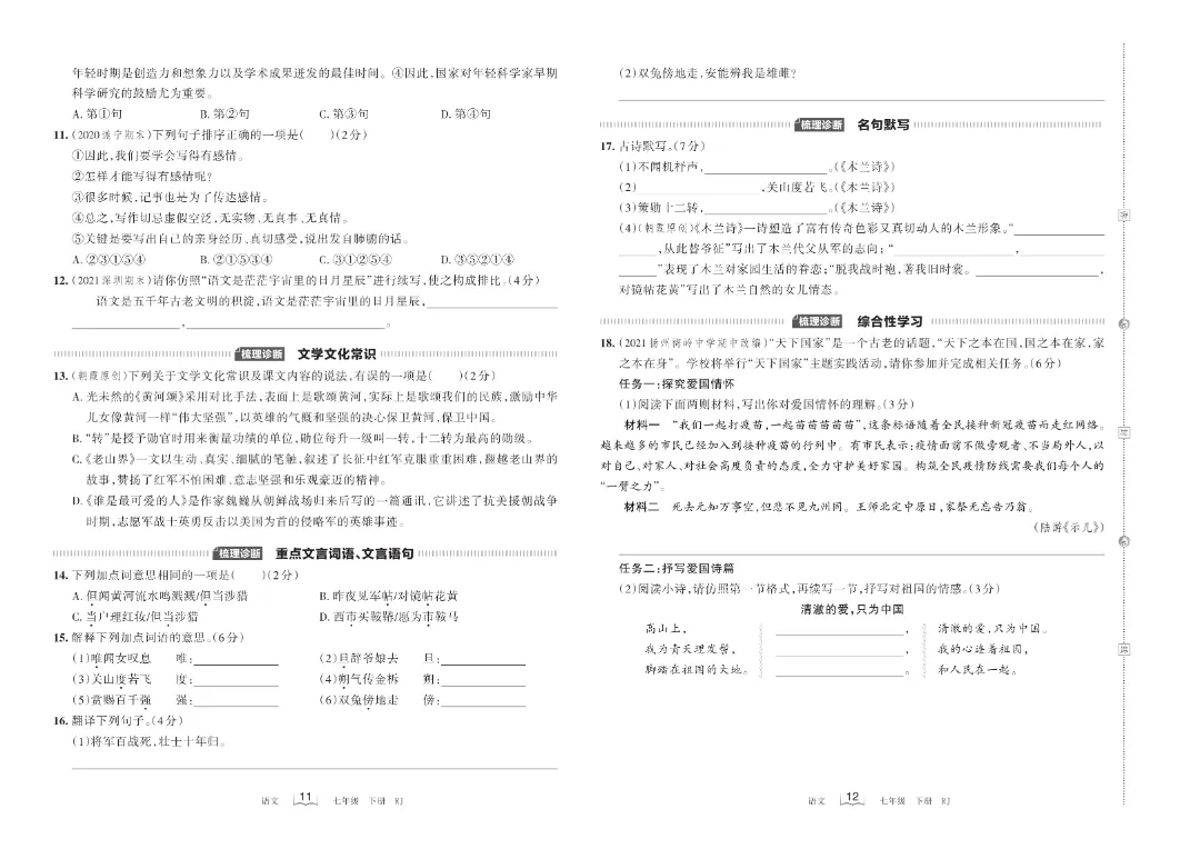 今天给大家分享的是:【七年级下册语文】【人教部编版】第二单元梳理式诊断卷+过关检测卷带答案解析|完整高清电子版可打印