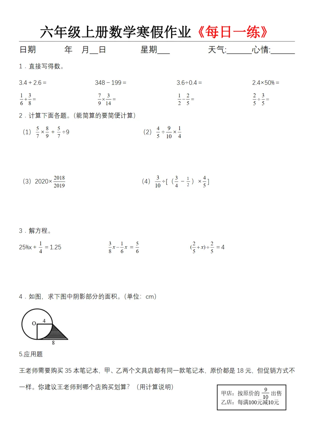 六年级(上)数学寒假作业《每日一练》