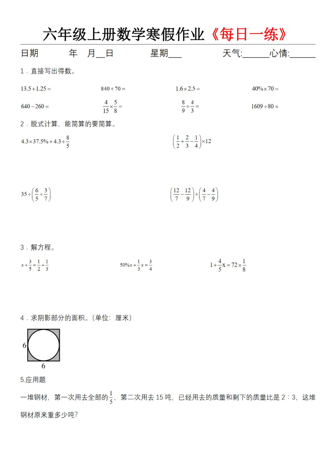 【高清电子版】六年级(上)数学寒假作业《每日一练》