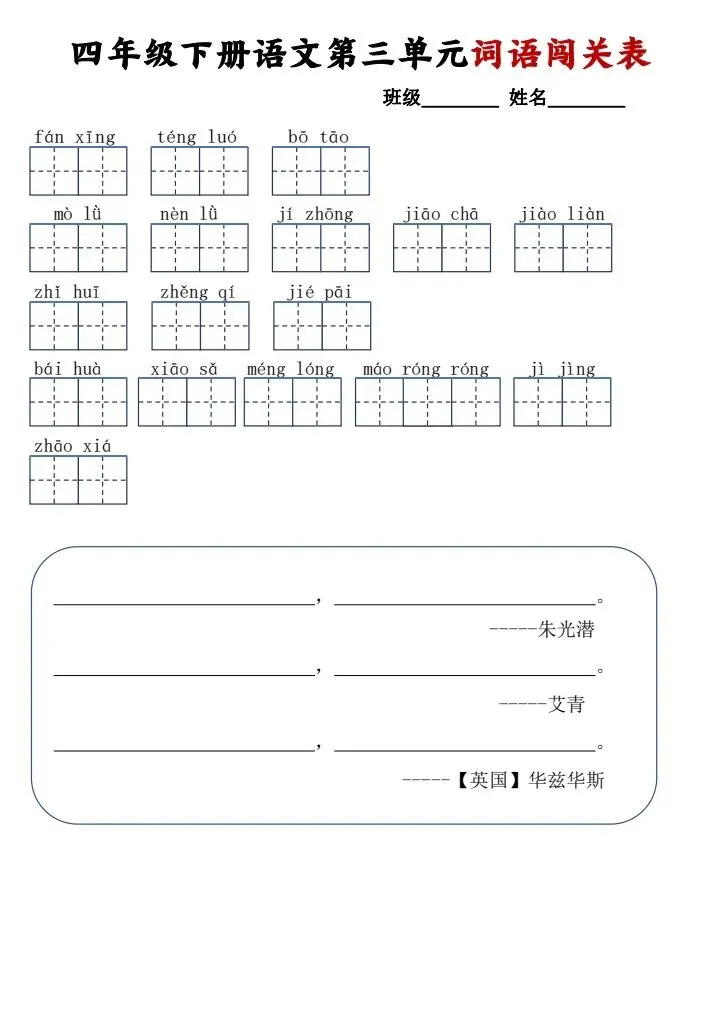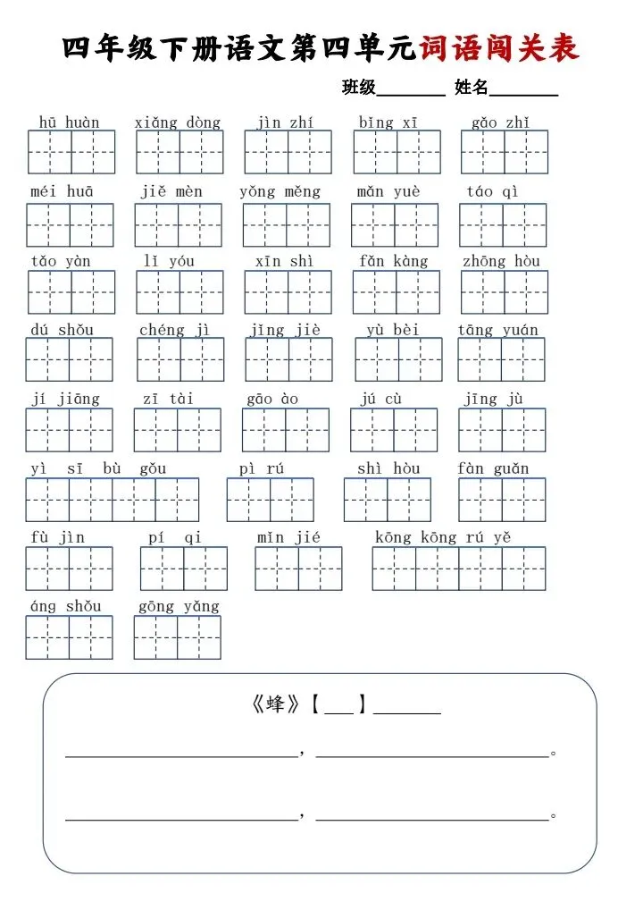 四年级下册语文《1~8单元词语闯关表》电子版可打印