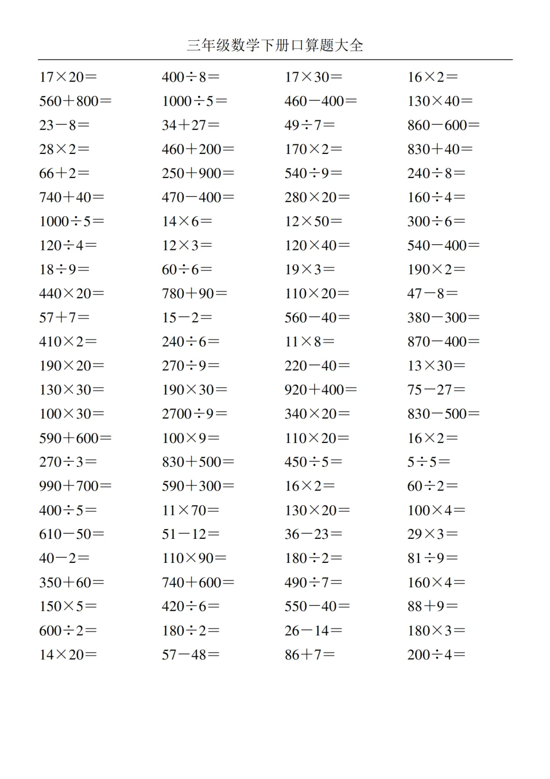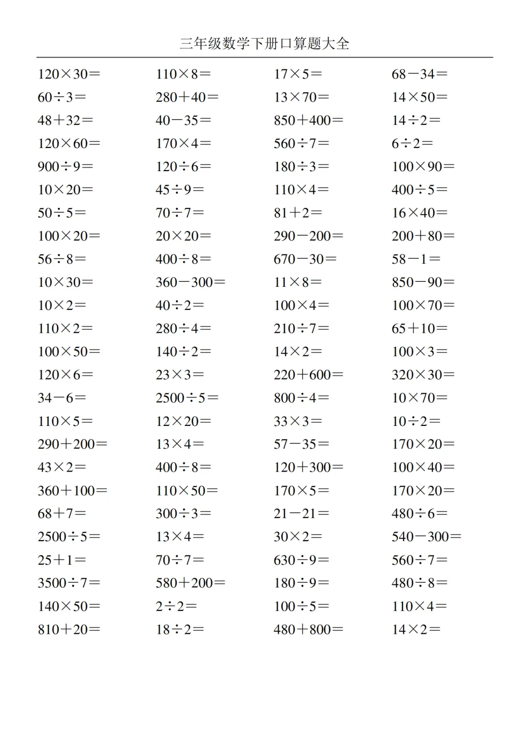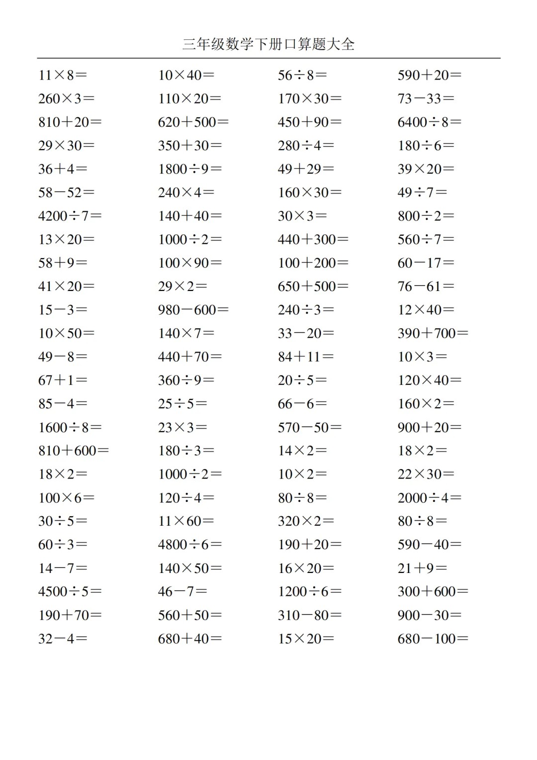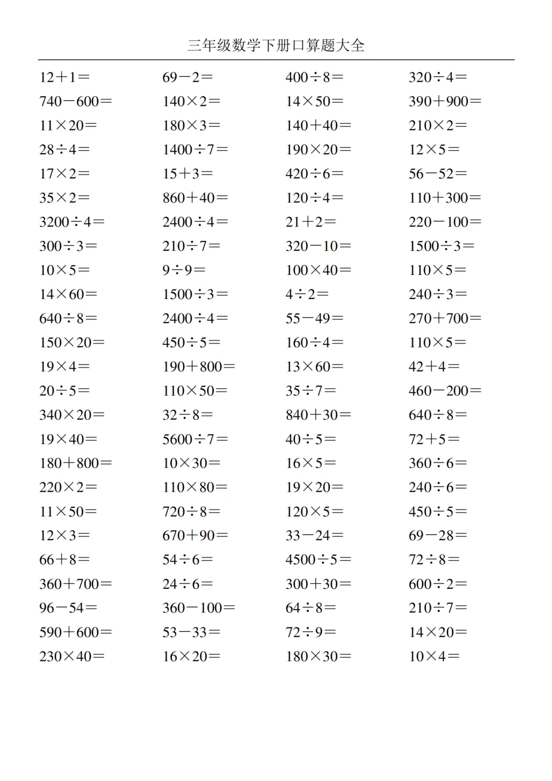 2026年新版《三年级下册数学口算大全》电子版可打印