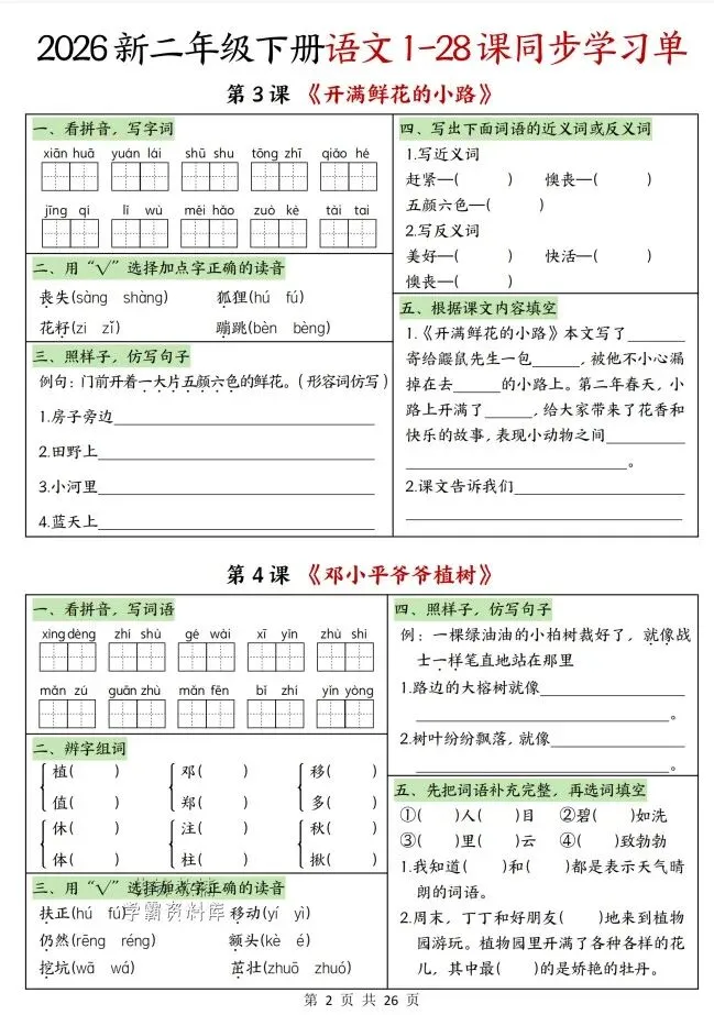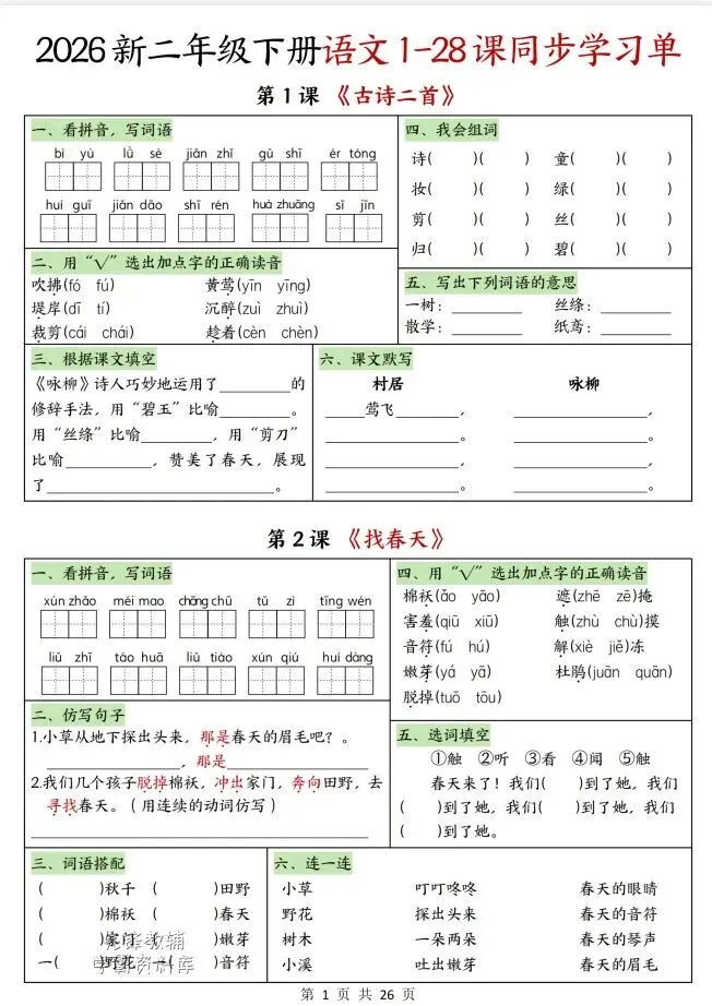 今天给大家整理了26春二年级语文下册1-4单元同步学习单,转发给朋友或班级群,受益更多人,帮助孩子学习!