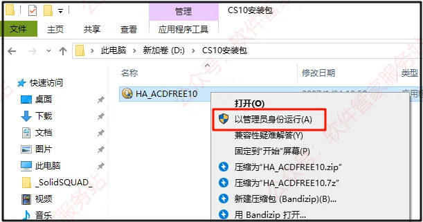 第三步:打开解压后的文件夹,选中【HA_ACDFREE10】右击【以管理员身份运行】。