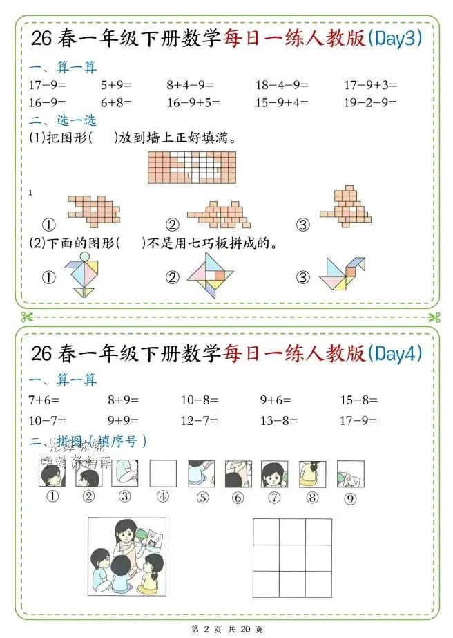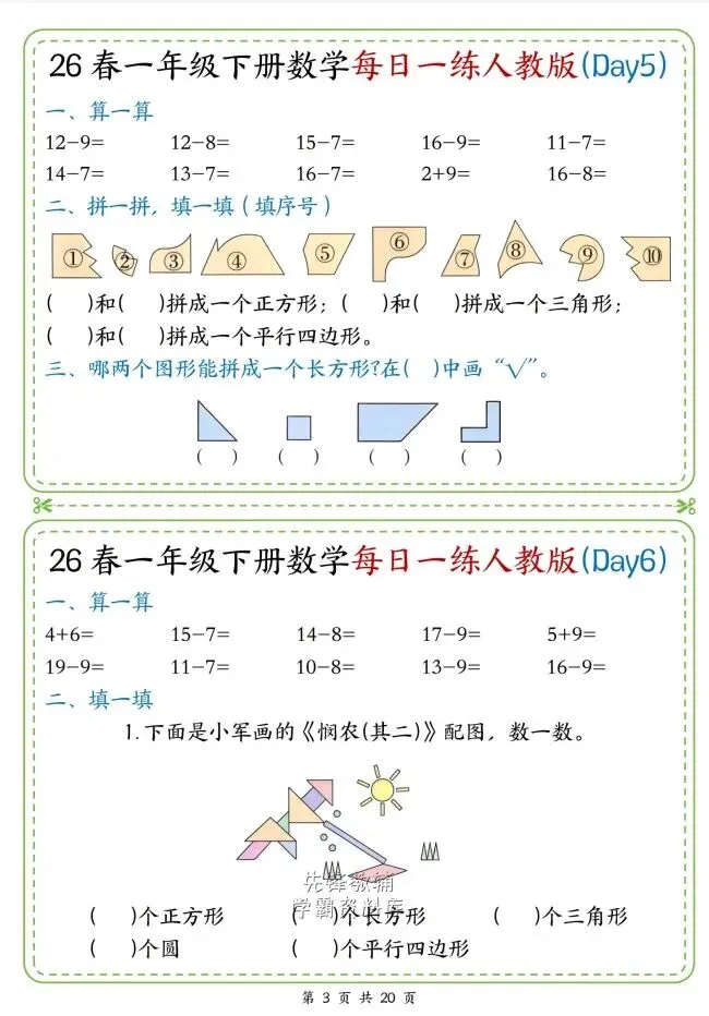 今天给大家整理了26春一年级数学人教版下册每日一练,转发给朋友或班级群,受益更多人,帮助孩子学习!