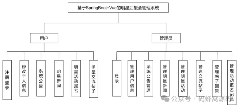 明星后援会管理系统的重要核心功能包括用户注册、用户登录、浏览明星新闻、展示明星活动、明星活动在线报名、明星交流社区、发布交流帖子、回复帖子等,以下为项目功能模块图:
