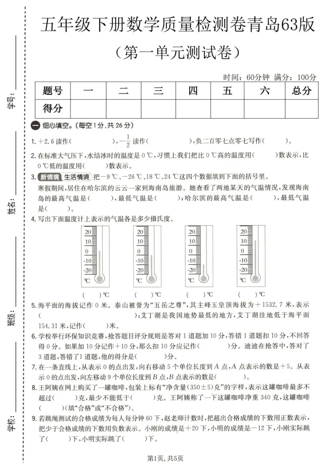 五年级下册青岛63版数学《第一单元检测试卷》(含答案 共2套),可打印
