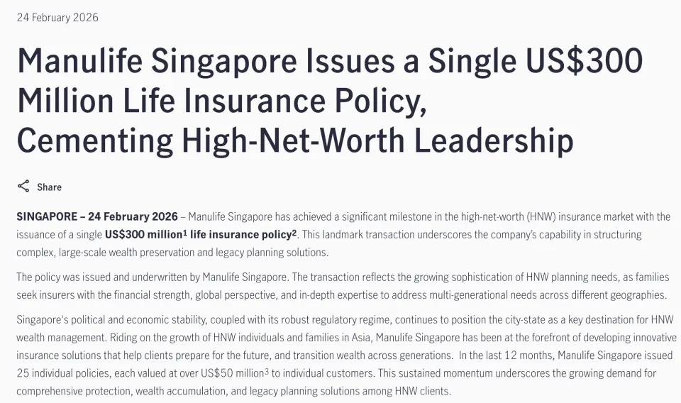 这并不只是数字上的超越,更是信任的转移。宏利在公告里说:随着亚洲高净值人士与家族数量不断增加,新加坡因为政治稳定以及监管制度完备,继续成为了财富管理与保险规划的重要地方。