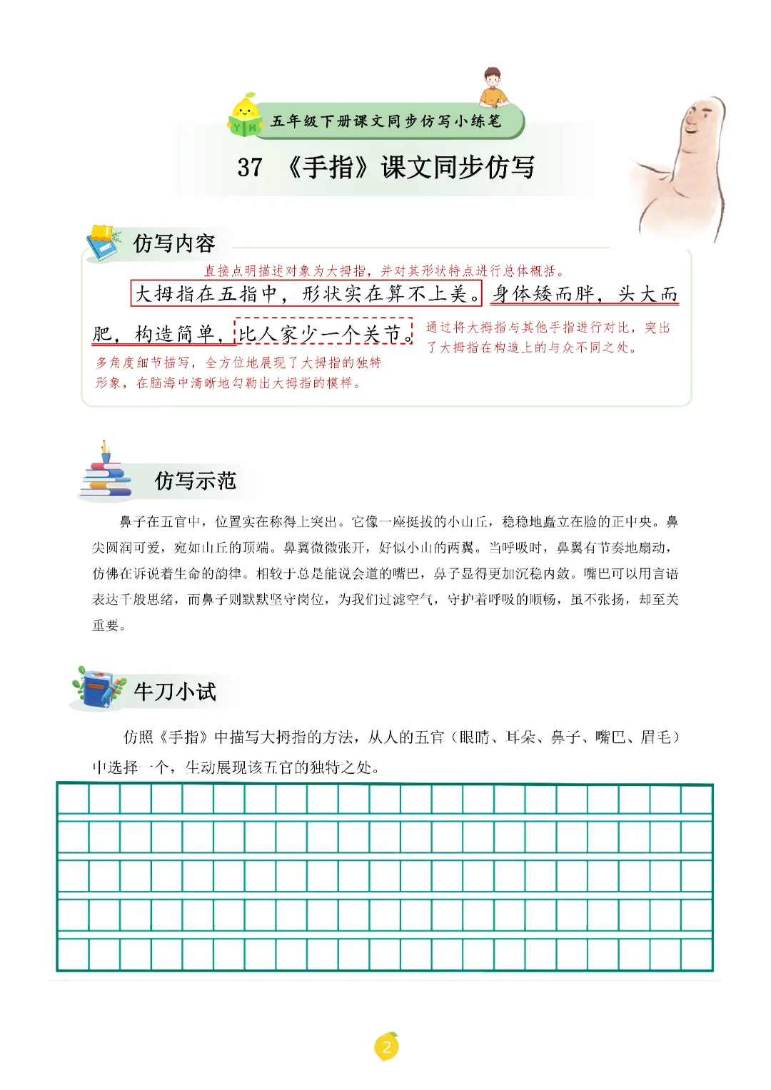 2026春人教统编版五年级下册语文《课文仿写小练笔》,含详细答案共68页,电子版可打印可下载。围绕五年级下册考试核心,展开练习,帮助孩子深入理解题型,夯实学科基础,培养孩子逻辑思维,提升知识综合运用能力与应试技巧,助力升学能力培养,从从容容游刃有余的度过春季学期。欢迎转发分享到班级群, 需要的家长们和老师们抓紧领取一份吧。