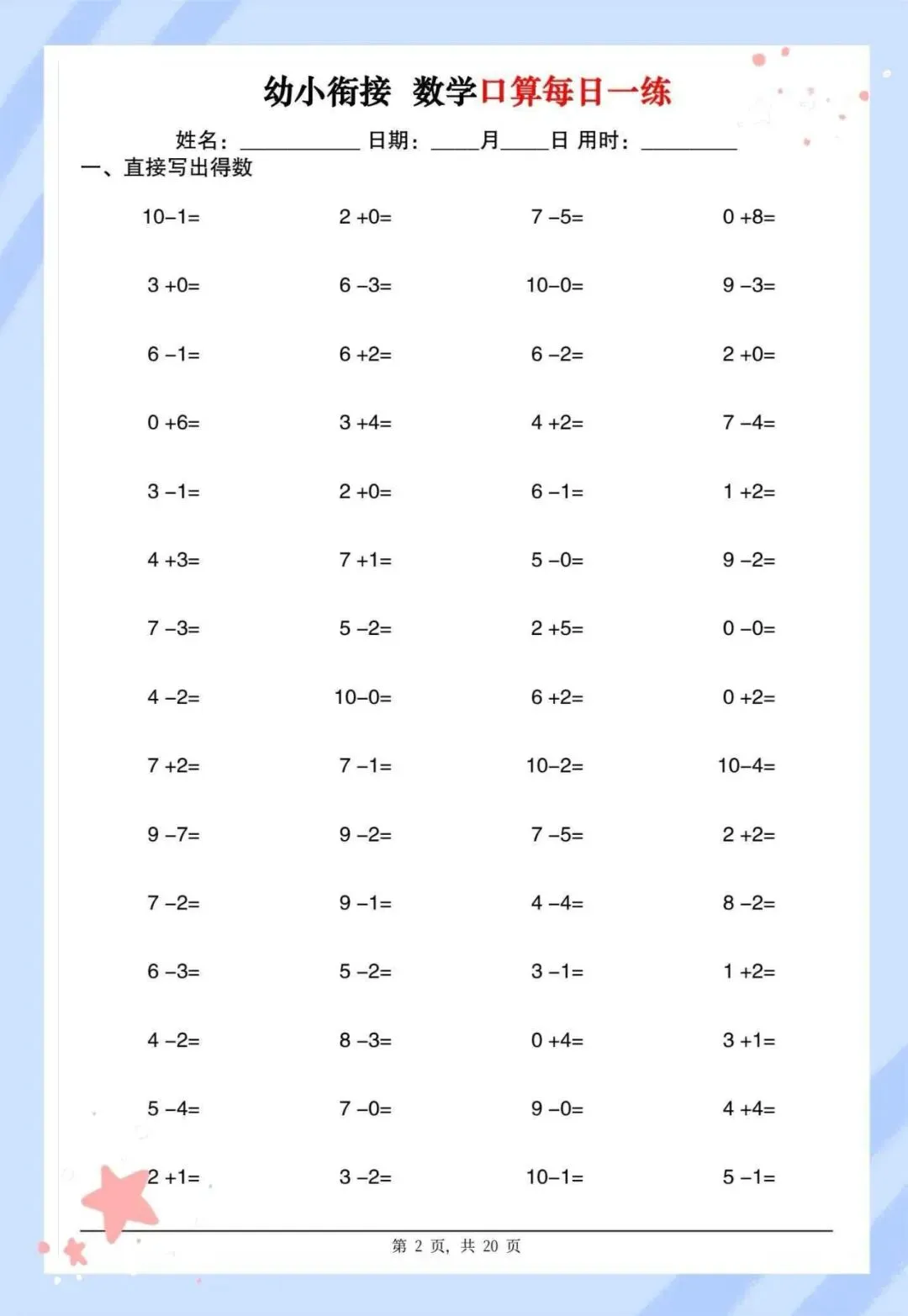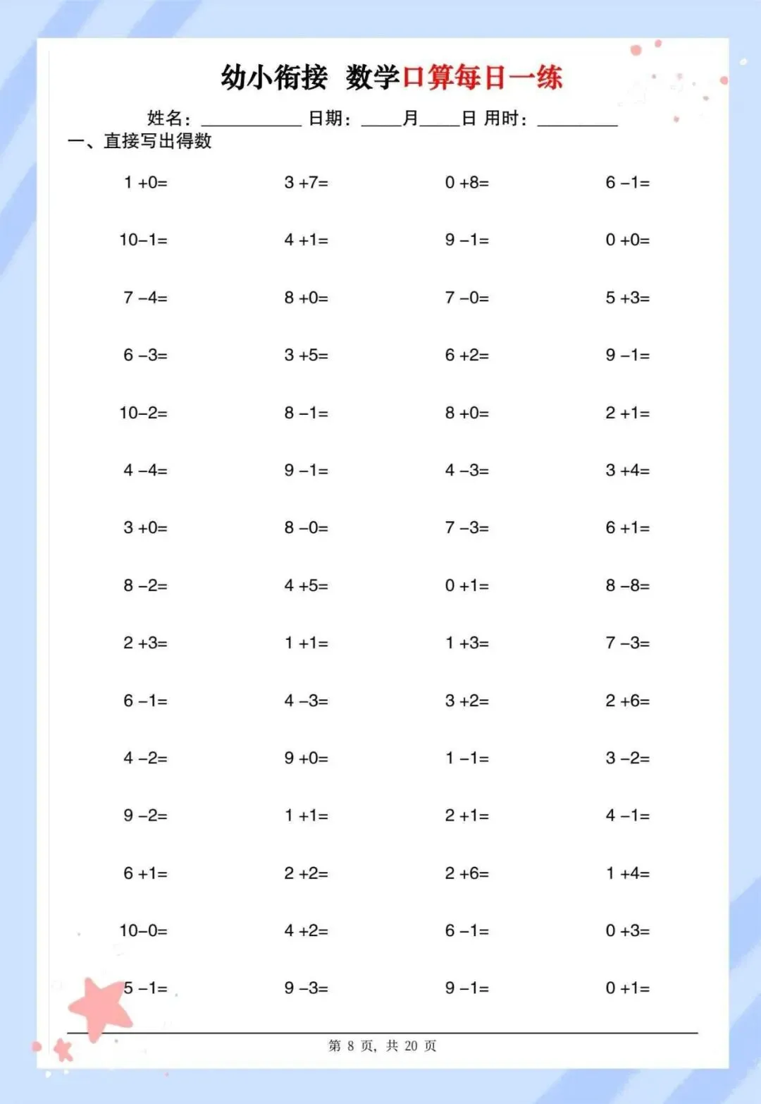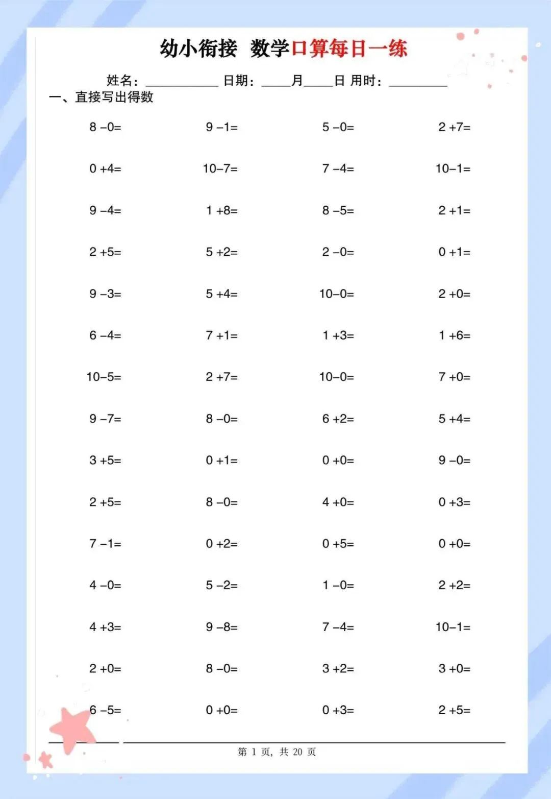 幼儿园10以内口算每日一练,20页可打印