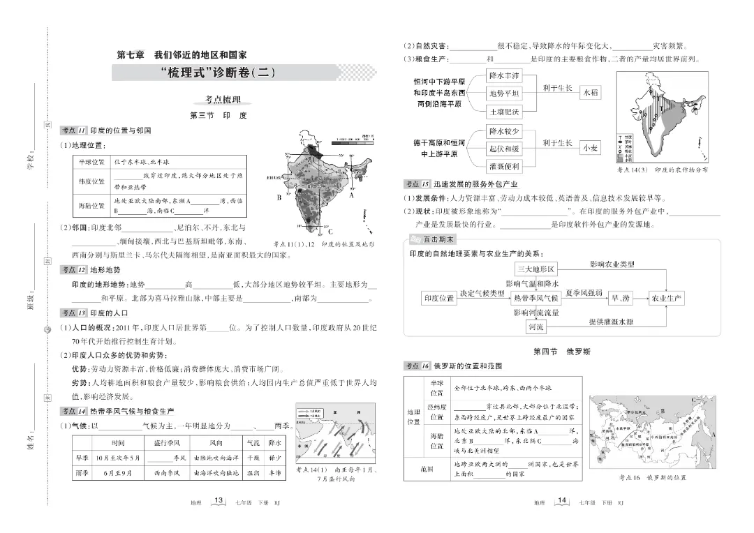 今天给大家分享的是:【七年级下册地理】【人教版】第七章我们临近的地区和国家梳理式诊断卷+过关检测卷带答案解析|完整高清电子版可打印