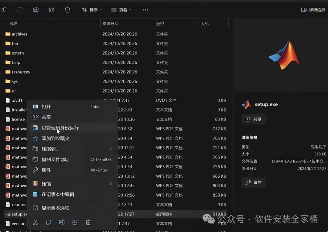 3、找到【setup】应用程序,右键选择【以管理员身份运行】它