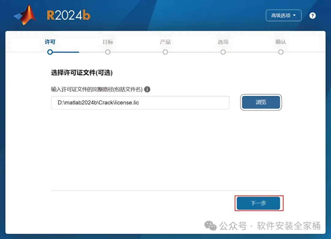 8、找到并选中安装包Crack文件夹下的【license.lic】,再点击【打开】。然后点击【下一步】