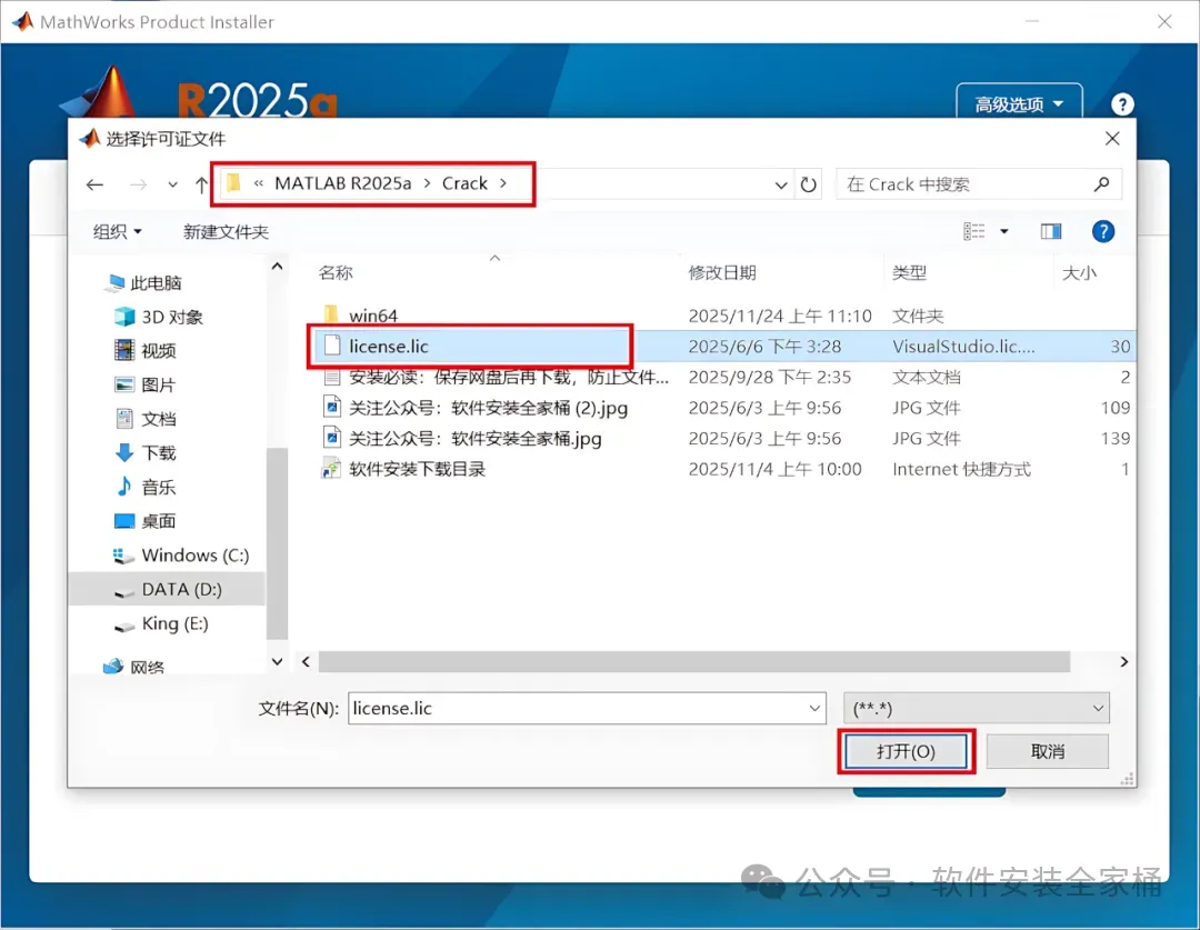 8、找到并选中安装包Crack文件夹下的【license.lic】,再点击【打开】。
