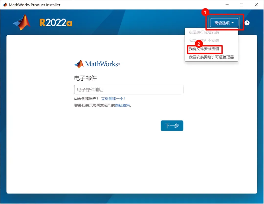 3、依次点击【高级选项】、【我有文件安装密钥】