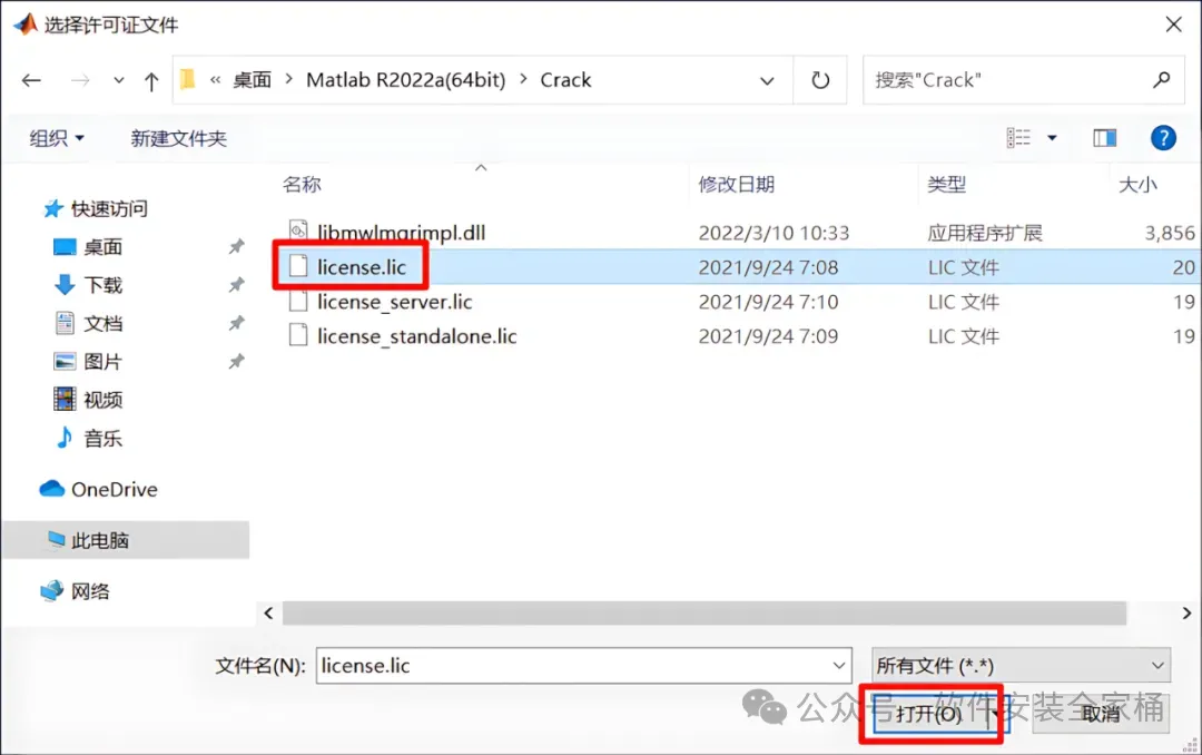 7、找到并选中安装包Crack文件夹下的【license.lic】,再点击【打开】
