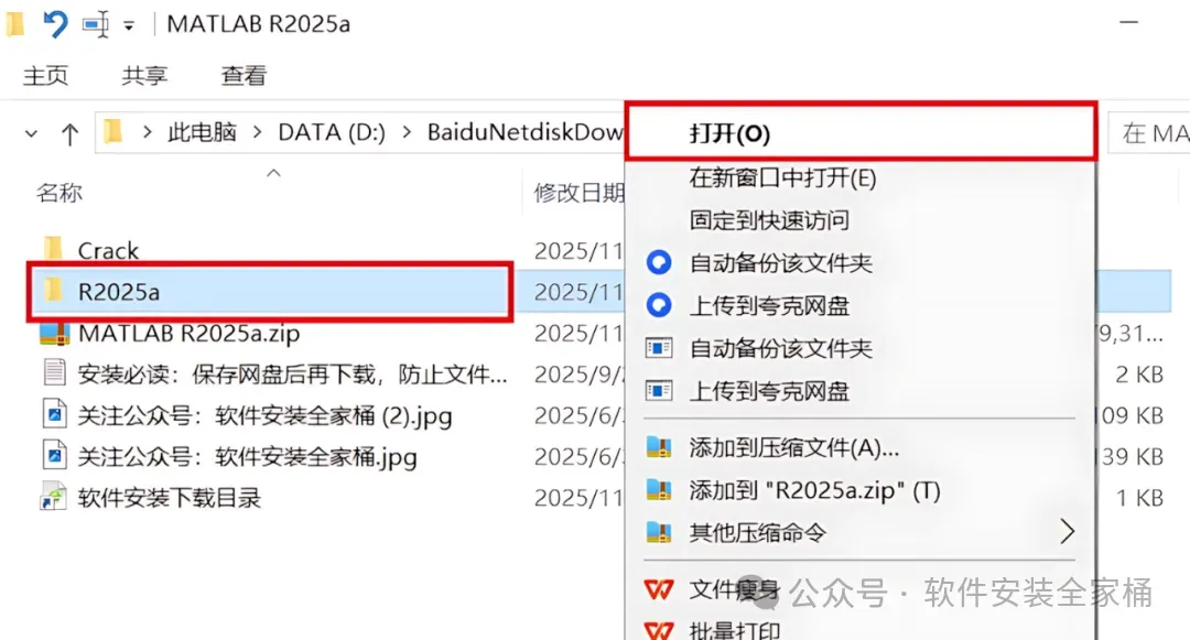 2、选择解压后的【R2025a】文件夹,鼠标右击【打开】。