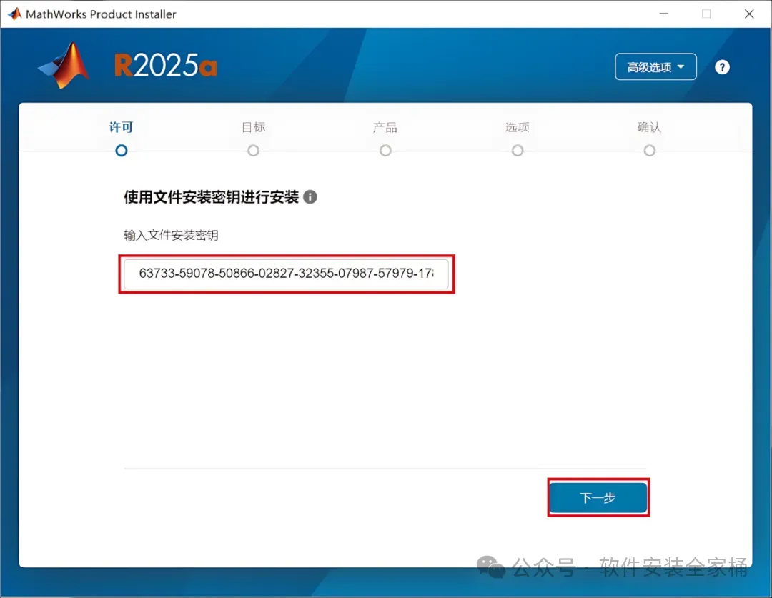 6、输入安装密钥:63733-59078-50866-02827-32355-07987-57979-17850-05492-24096-05227-42839-55624-20610-22640-51189,再点击【下一步】。