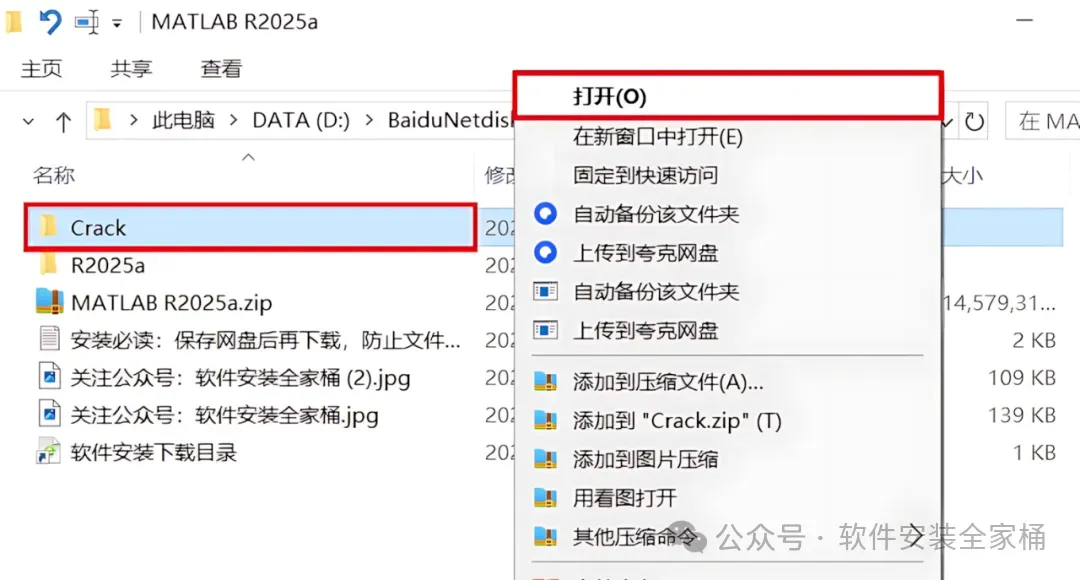 16、回到Matlab R2025a文件夹,找到【Crack】文件夹,右键点击【打开】。