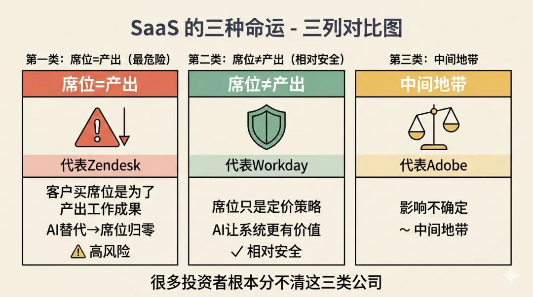 如果你的客户买席位是为了产出工作成果,那 AI 能替代这些工作,席位就不需要了。最典型的例子是 Zendesk——当客户用上 AI 客服(Sierra、Decagon),他们需要的人工席位可能降到零。