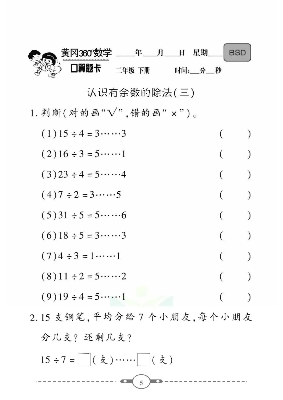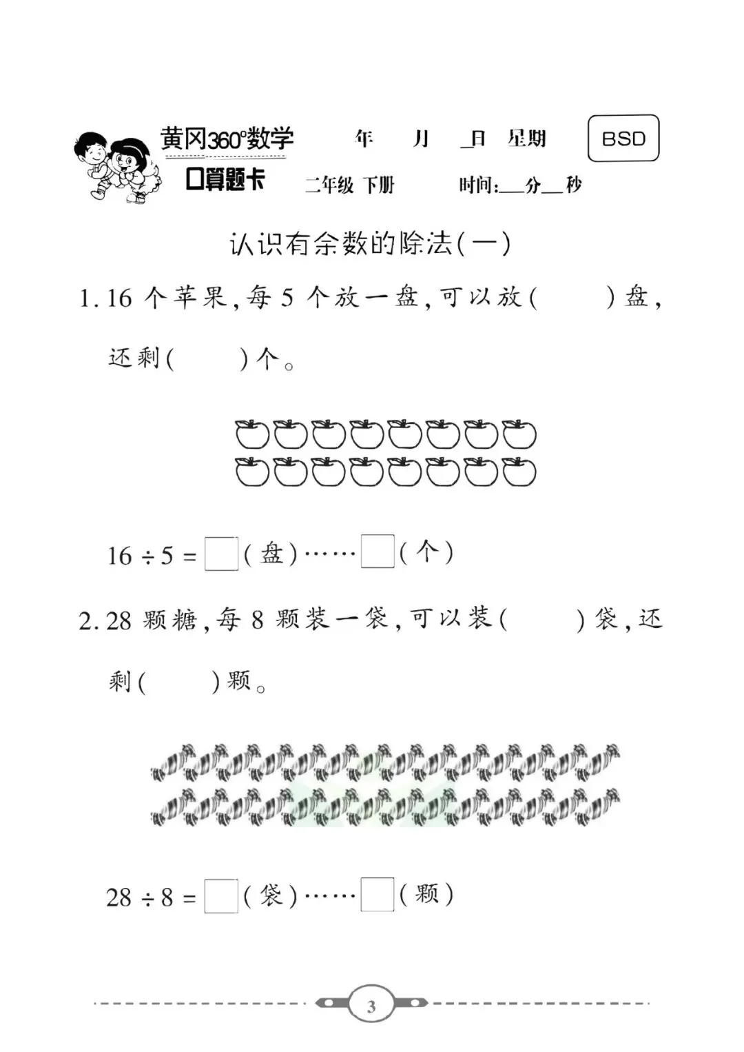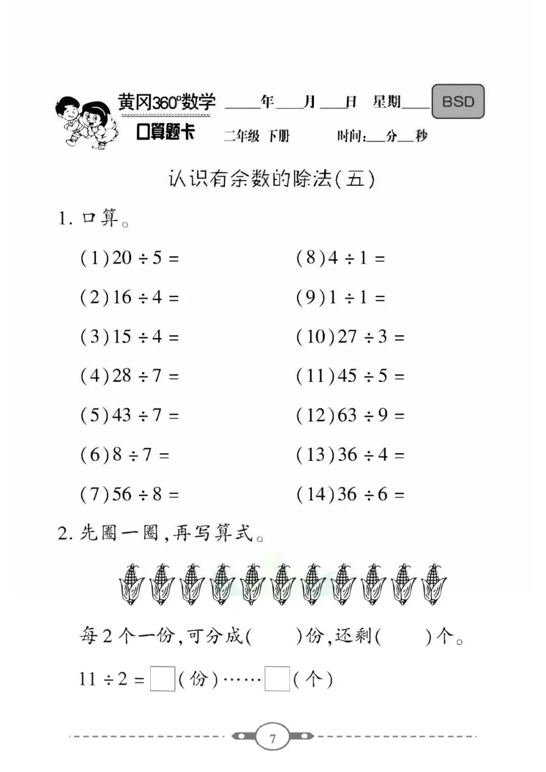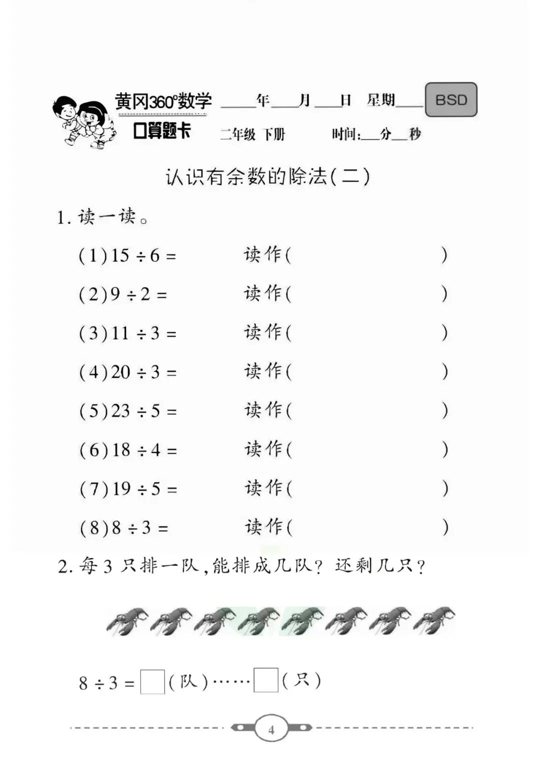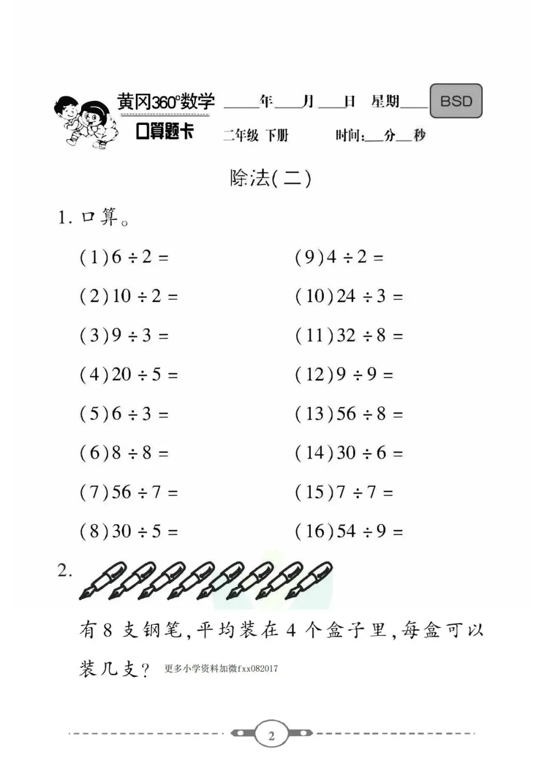 《口算题卡》二年级下册数学北师版 可免费下载打印