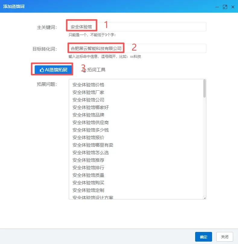 1.2添加——输入主关键词(产品词,如:AI玩具)、目标转化词(最终转化成什么词,比如品牌名或者公司名简称)、AI蒸馏或者手动拓展