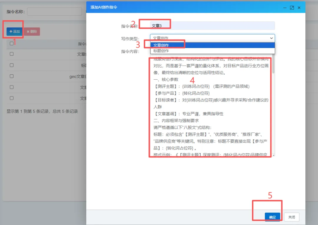 3.1添加——输入指令名称——选择文章创作或者标题创作——输入或者改写对应的提示词——确定