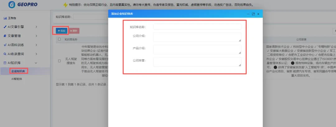 点击AI知识库-企业知识库-填写参数