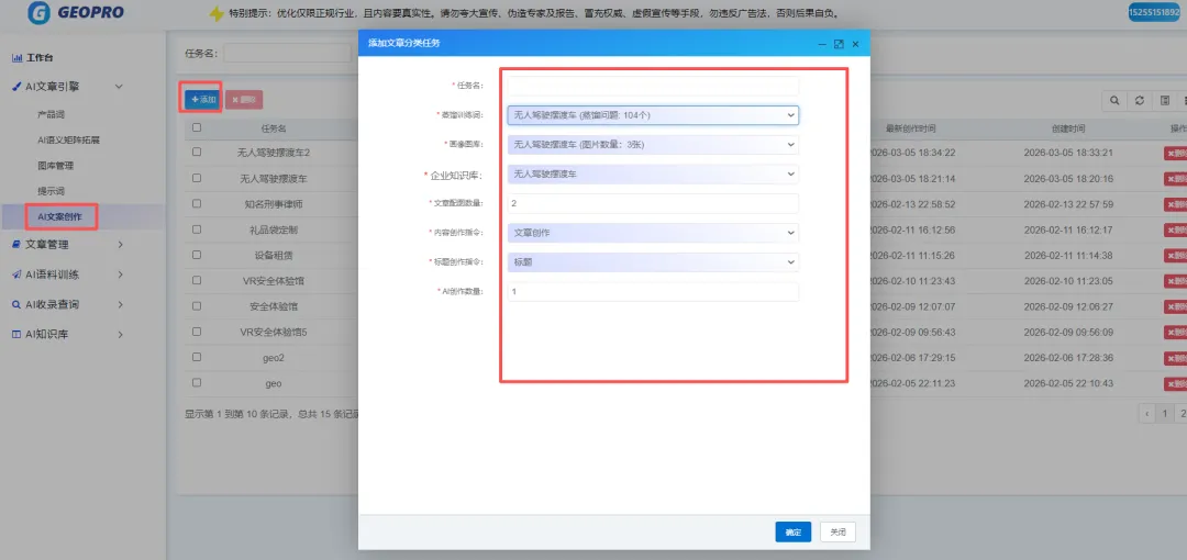 4.1依次点击:添加——输入任务名称——选择训练词——图库——输入图片数量——选择知识库——选择指令——输入创作数量——确定