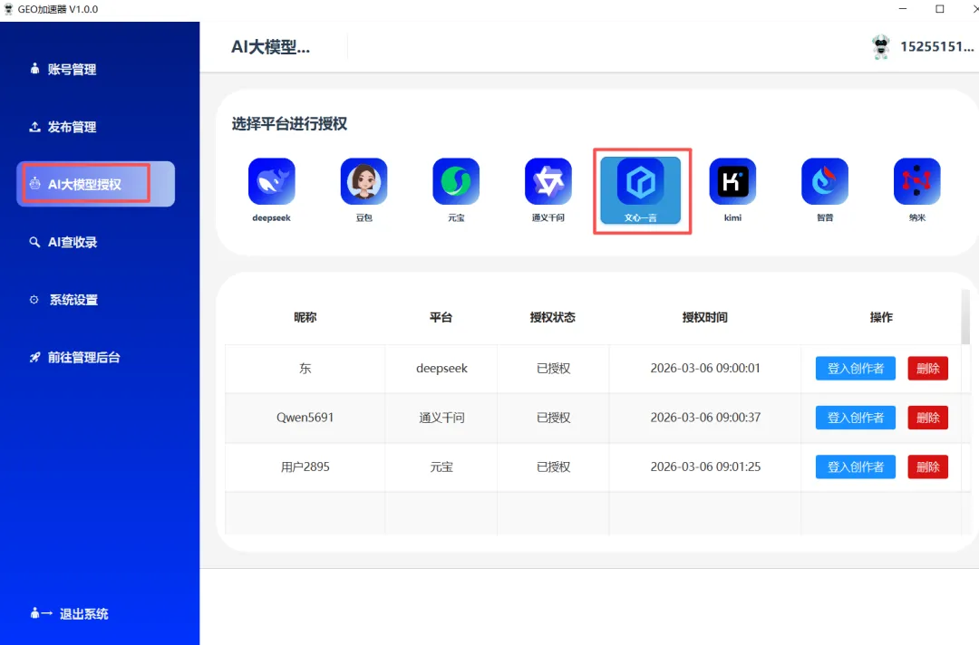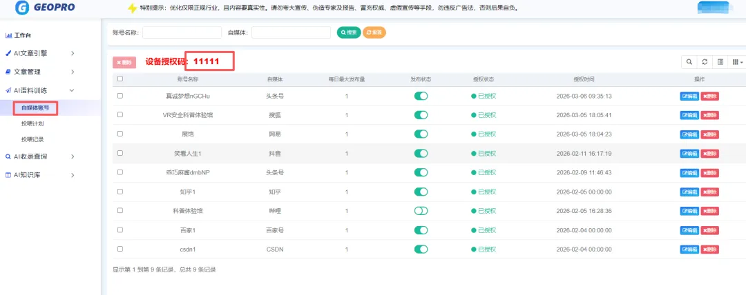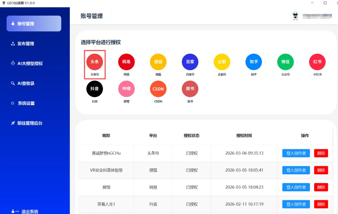 通过GEO加速器.exe(需要提供授权码),授权自媒体账号。