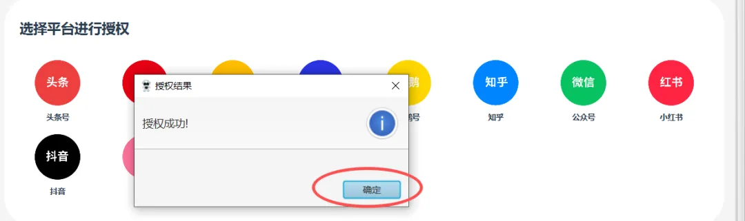 单击自媒体平台,弹出窗口,登录自己的账号,登录成功后不要操作,系统会自动关闭,显示授权成功。