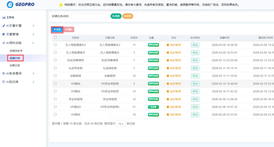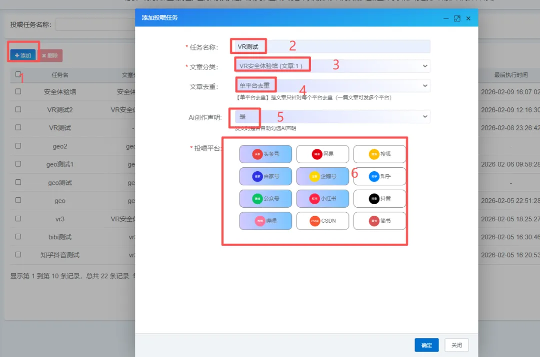 依次点击:添加——任务名称——选择文章——选择去重——选择AI声明——选择投喂平台——确定