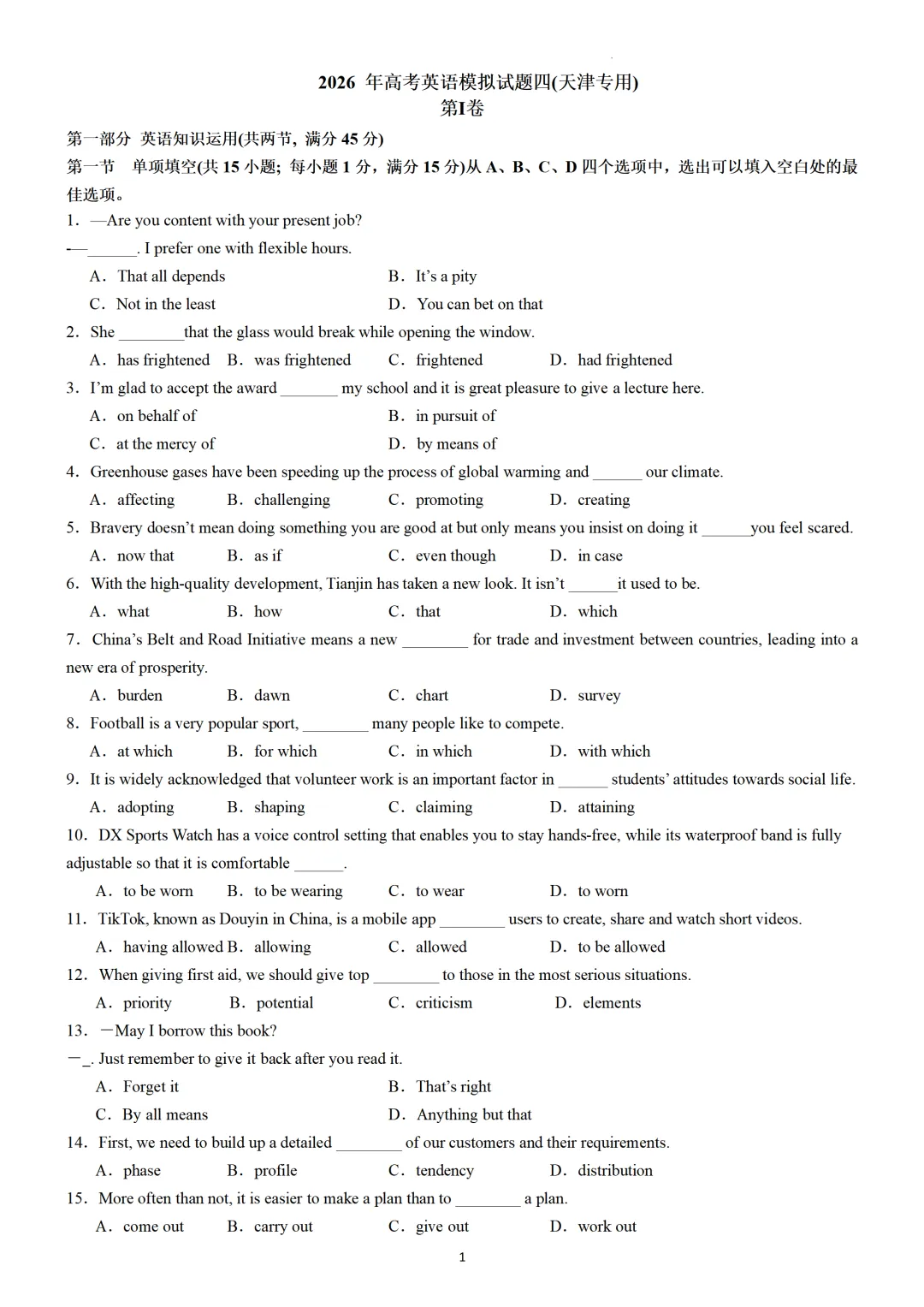 【可打印】④2026 年高考英语模拟试题四(天津专用)(附解析) 点击上方“蓝字”免费关注! 本套试卷+答案解析下载入口 关注“卿卿侃古今”公众号 点击左下角阅读原文可下载 相关链接: 【真题】2007-2025年天津市高考英语真题汇总(持续更新中~) 【真题】2011-2023年天津高考英语听力真题在线测试 【模拟】2025届高三英语听力机考模拟试题在线测试 【可下载】2025-2026年高中英语试题汇总(附解析)【持续更新中】 【可下载】2025-2026学年度高一高二高三开学考试模拟试卷(天津专用)(附解析) 【目录1】高中英语阅读理解限时训练大全(持续更新中~) 【目录2】高中英语完形填空限时训练大全(持续更新中~) 【目录3】高中英语书面表达大全(持续更新中~) 【目录4】高中英语听力训练大全(持续更新中~) 【目录5】高中英语单选题大全(持续更新中~) 【目录6】高中英语语法题大全(持续更新中~) 【目录7】高中英语阅读表达题大全(持续更新中~) 【目录8】科普知识汇总 【目录9】中高考学法知识汇总 【目录10】高考英语真题+名校模拟真题+月考和期中期末试题(持续更新中~) 【目录11】暑期高考英语备考资料大全持续更新中~【汇总】中高考志愿填报资料大全 【汇总】高中英语月考和期中期末试题(持续更新中~) 【汇总】2025届高三英语一模试题(附解析) 【汇总】2025届高三英语二模试题(附解析) 【汇总】2025届高三英语三模试题(附解析) 【汇总】2024届高三英语一模二模三模试题(附解析) 【汇总】2024届高考英语押题卷(附解析) 【汇总】2025届高三英语周考综合练(附解析) 【汇总】免费下载!2025年天津高考押题预测卷英语试卷12套全(附解析) 【汇总】2025年高中英语期中考试试题(持续更新中~) 【汇总】2024年高中英语月考和期中期末试题(持续更新中~) 【题库】高三英语限时训练(持续更新中~) 【题库】高三英语试题汇编(持续更新中~) 【题库】高二英语试题汇编(持续更新中~) 【题库】高一英语试题汇编(持续更新中~) 【高考词汇】(新)外研版高中英语全七册词汇表(附音频) 【中考词汇】初中英语外研版必备单词表(完整版),可打印 建议收藏保存 点击阅读原文查更多