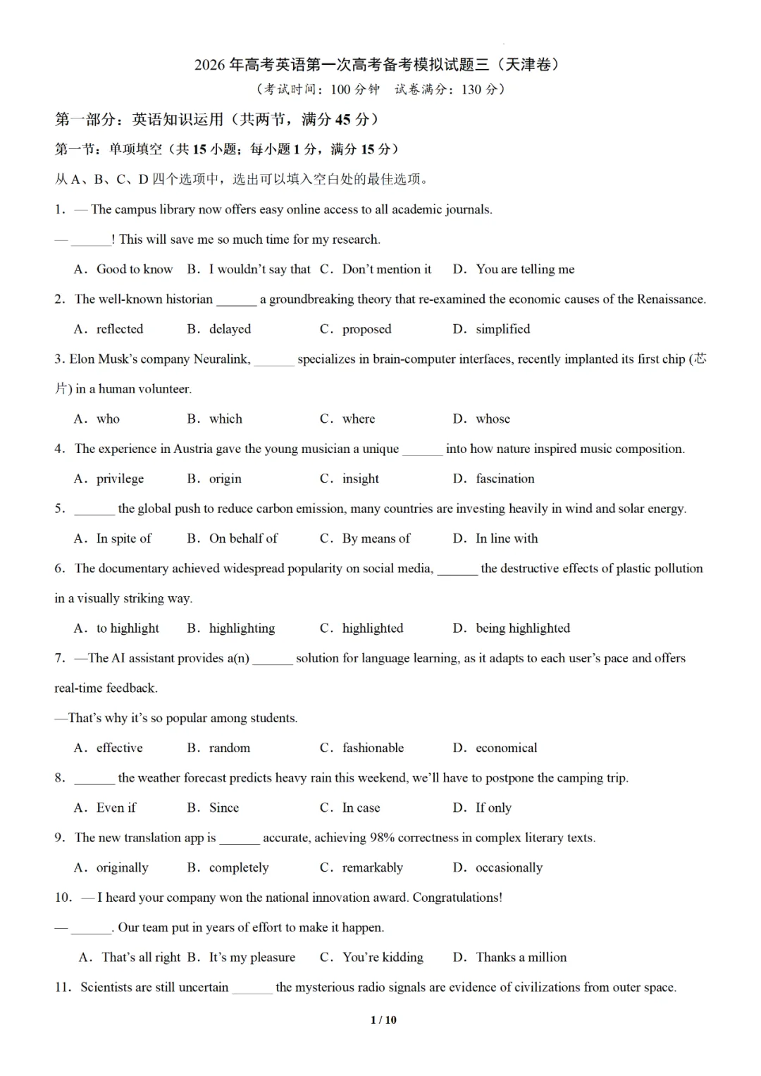 【可打印】2026年高考英语第一次高考备考模拟试题三(天津卷)(附解析) 点击上方“蓝字”免费关注! 本套试卷+答案解析下载入口 关注“卿卿侃古今”公众号 点击左下角阅读原文可下载 相关链接: 2007-2025年天津市高考英语真题汇总(持续更新中~) 2011-2023年天津高考英语听力真题在线测试 【高考英语听力在线测试】高考听力机考模拟试题大全(持续更新中) 【可下载】2025-2026年高中英语试题汇总(附解析)【持续更新中】 【汇总】高中英语月考和期中期末试题(持续更新中~) 【题库】高一英语试题汇编(持续更新中~) 【题库】高二英语试题汇编(持续更新中~) 【题库】高三英语试题汇编(持续更新中~) 【可下载】高三英语上学期期末试题16套(附解析) 【可下载】高二英语上学期期末试题10套(附解析) 【可下载】高一英语上学期期末试题汇9套(附解析) 【可下载】2025-2026学年度高一高二高三开学考试模拟试卷(天津专用)(附解析) 新外研版高中英语高清电子课本、课文原文和译文、单元同步复习资料和试题【持续更新中】 【目录1】高中英语阅读理解限时训练大全(持续更新中~) 【目录2】高中英语完形填空限时训练大全(持续更新中~) 【目录3】高中英语书面表达大全(持续更新中~) 【目录4】高中英语听力训练大全(持续更新中~) 【目录5】高中英语单选题大全(持续更新中~) 【目录6】高中英语语法题大全(持续更新中~) 【目录7】高中英语阅读表达题大全(持续更新中~) 【目录8】科普知识汇总 【目录9】中高考学法知识汇总 【目录10】高考英语真题+名校模拟真题+月考和期中期末试题(持续更新中~) 【目录11】暑期高考英语备考资料大全持续更新中~【汇总】中高考志愿填报资料大全 【汇总】高中英语月考和期中期末试题(持续更新中~) 【汇总】2025届高三英语一模试题(附解析) 【汇总】2024届高三英语一模二模三模试题(附解析) 【汇总】2024届高考英语押题卷(附解析) 【汇总】2025届高三英语周考综合练(附解析) 【题库】高三英语限时训练(持续更新中~) 【模拟】2025届高三英语听力机考模拟试题在线测试 【高考词汇】(新)外研版高中英语全七册词汇表(附音频) 【中考词汇】初中英语外研版必备单词表(完整版),可打印 建议收藏保存 点击阅读原文查更多