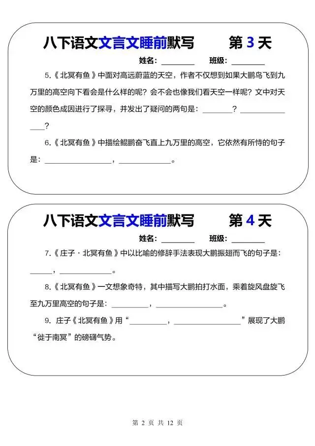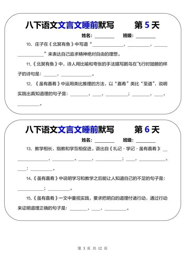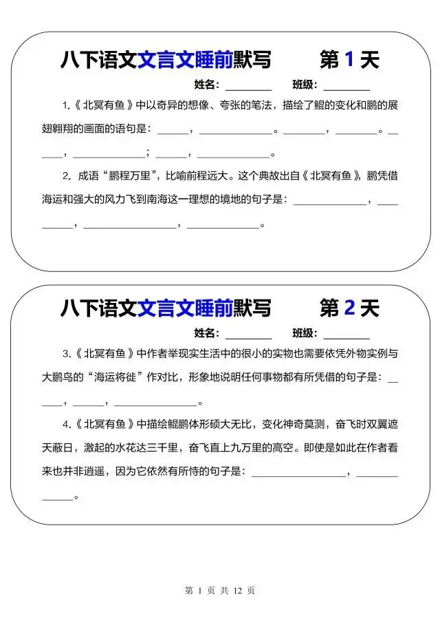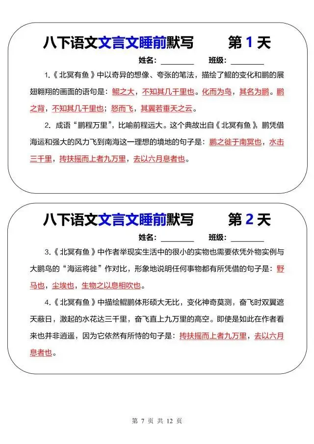 今日为大家更新了最近超火的学习资料,新八年级下册语文文言文睡前默写(电子版可打印),建议分享到班级群/年级群,让其他家长打印出来,帮助孩子学习!